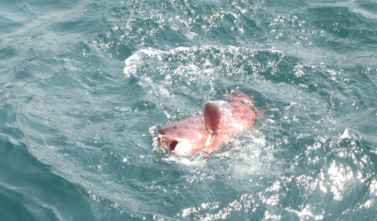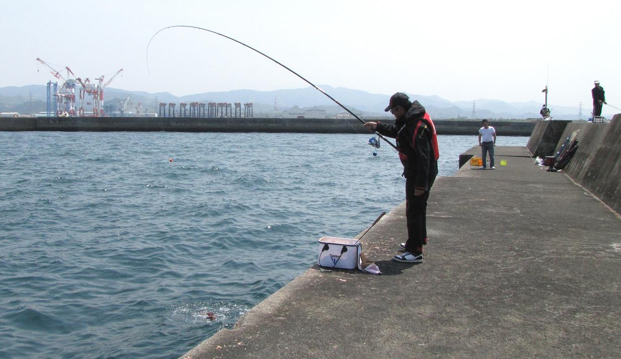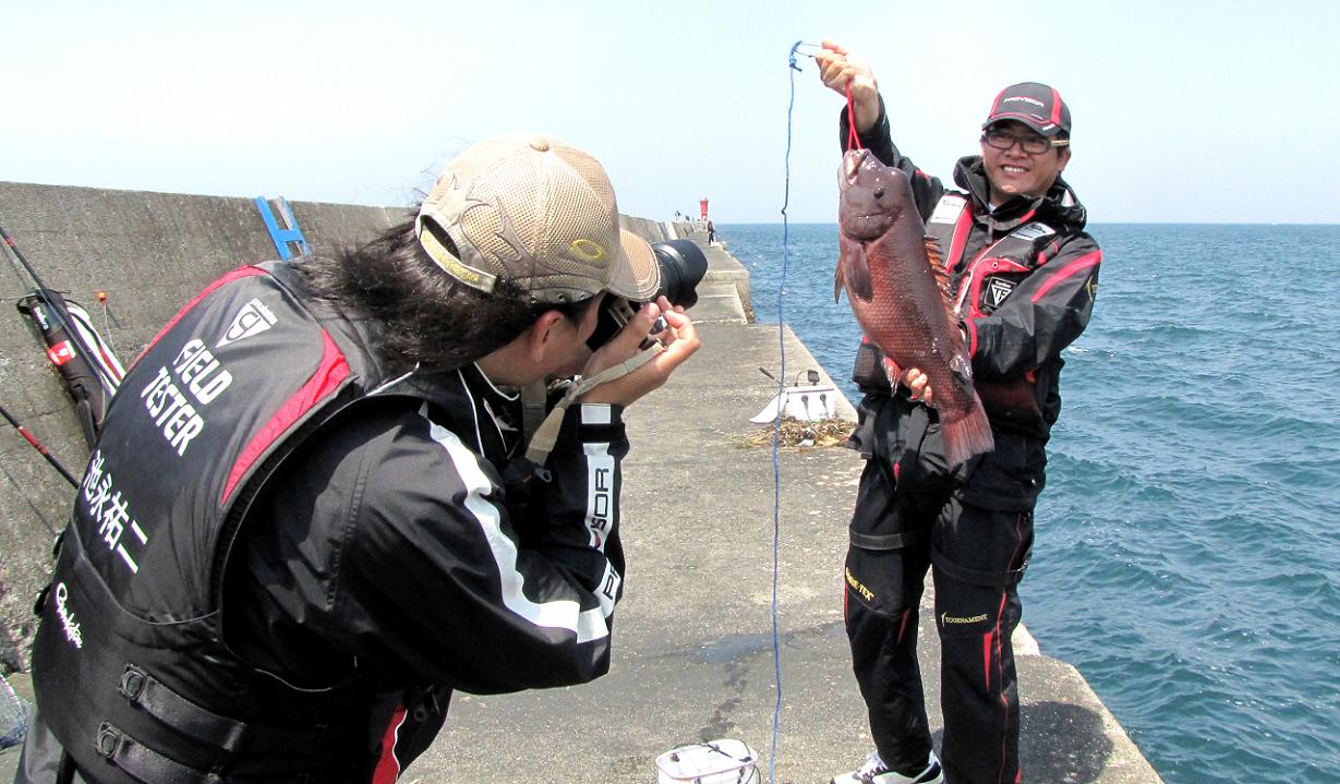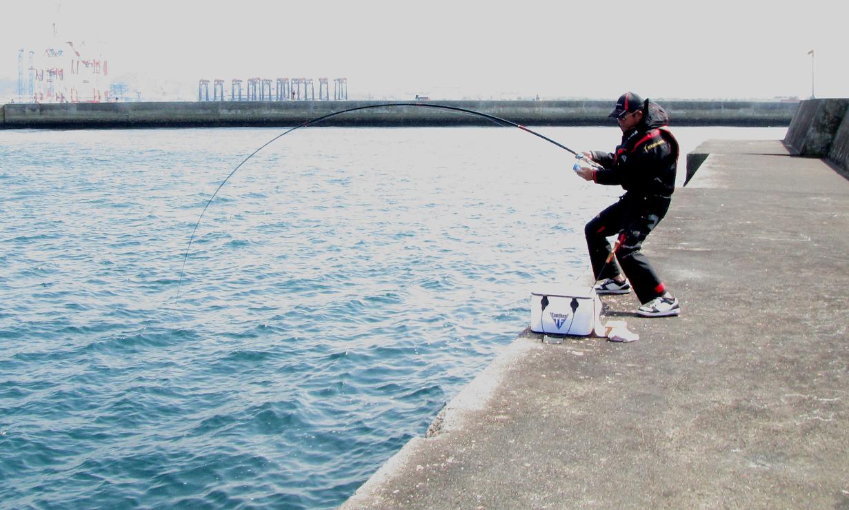 午前中は音沙汰がなかったため、二人で低い方を釣っていたのを、林さんだけ犬走りにあげて分かれて釣り始めたら、低い方の俞(ユウ)さんに待望のアタリです。昨日より少し大きい4.5kgが躍り出たのです。
