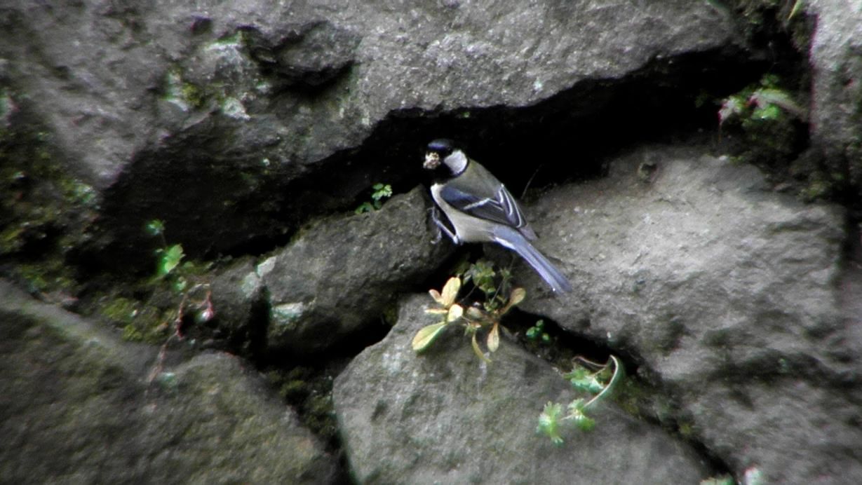 シジュウカラの親が、石垣の間にエサを運んでいます