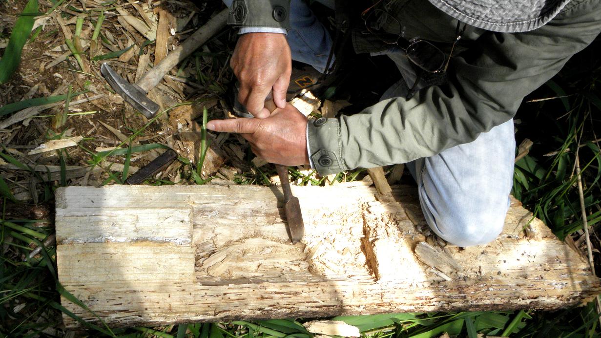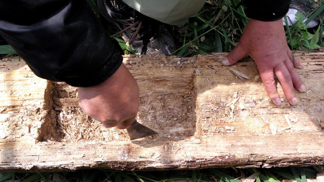 二つに割った木に穴を開けていきます