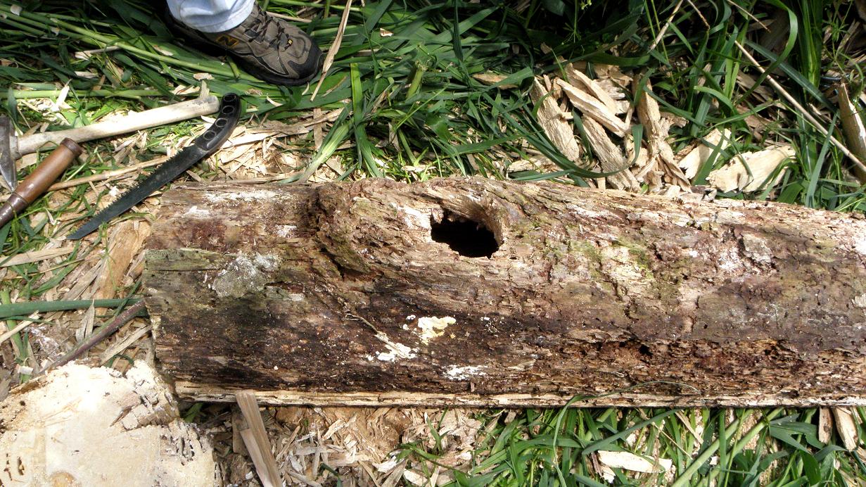 でも、その巣穴のある枯れ木は、9月に切り倒されてしまいました。HOKKEさんが、切られて1mくらいにされた巣穴のあった枯れ木を保管していました。