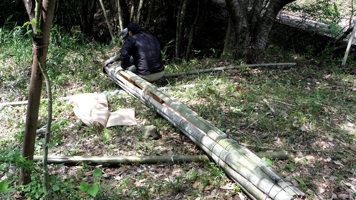 1mの巣穴の木に割った竹を繋ぎ合わせます(軽量化)