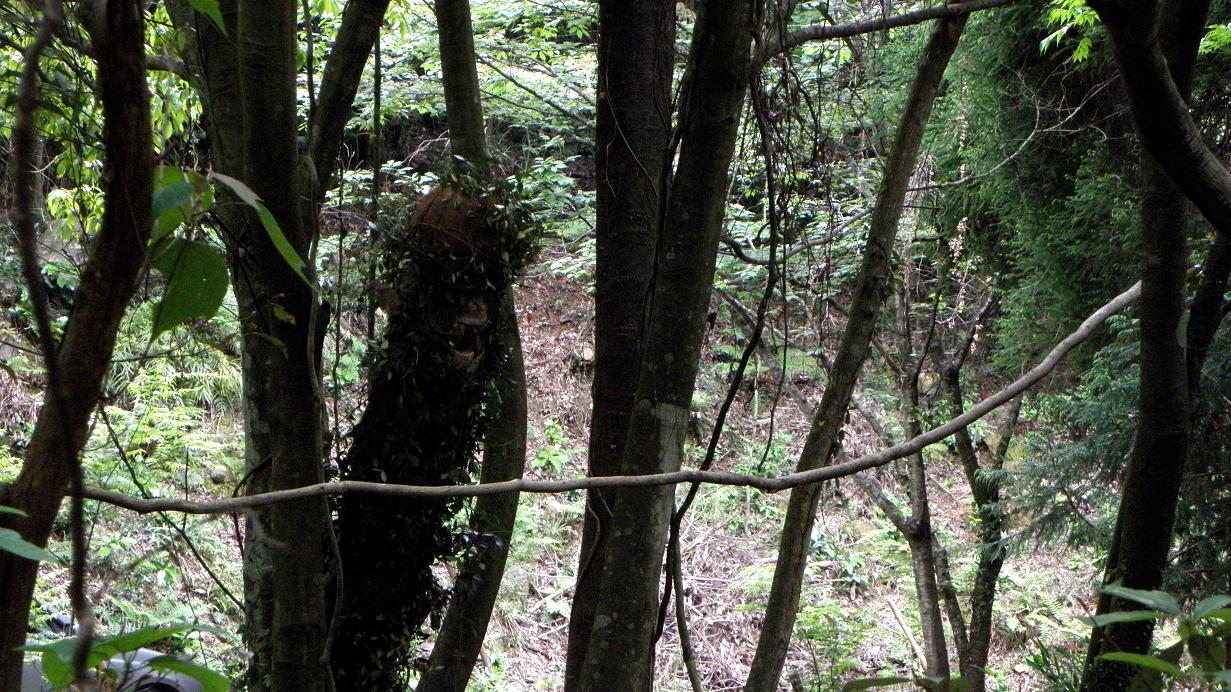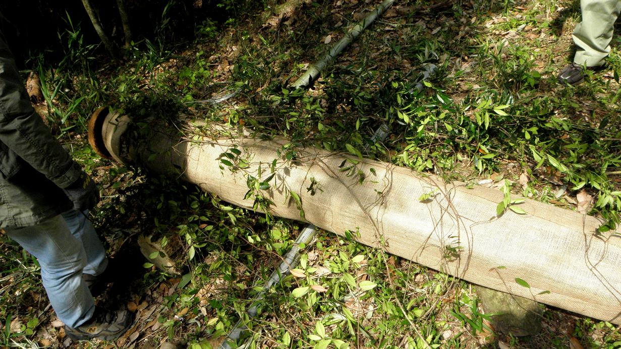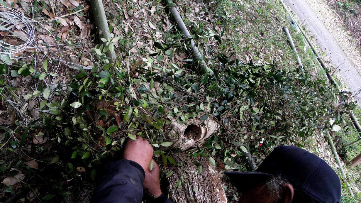 今日はその枯れ木を2分割して巣穴を堀り、それを元の場所に設置したのです。1mの木を4m近い竹で包み込み、偽装してワイヤーなどを利用して昨年同様に傾斜をつけ、前方には昨年と同じ様に止まり木も設置しています。
