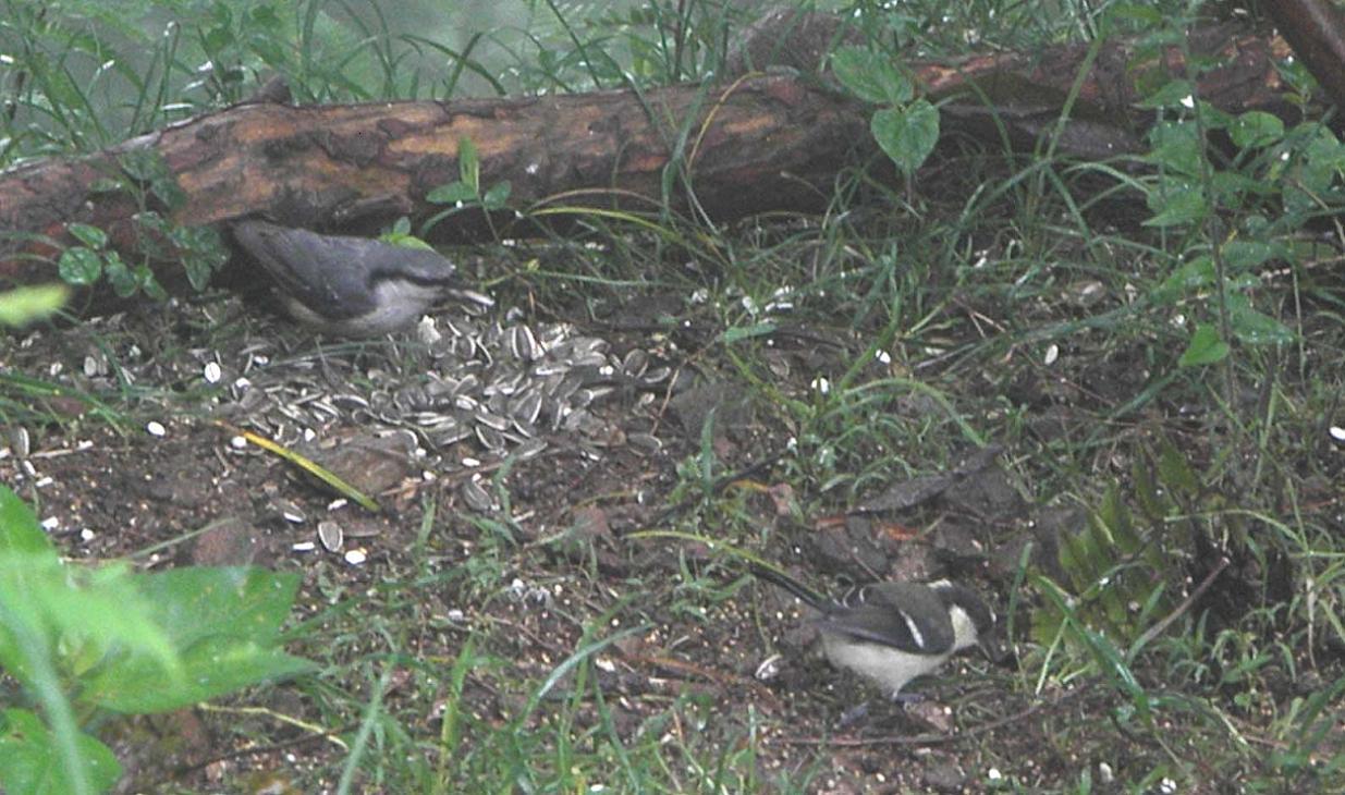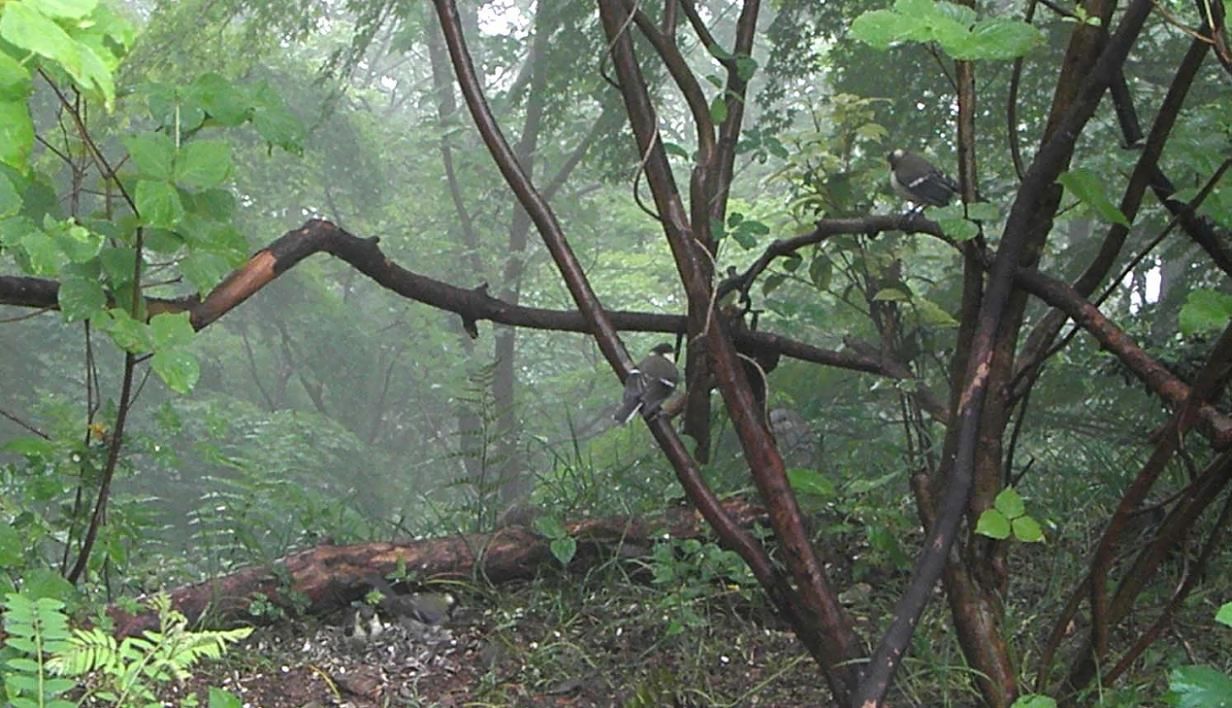 2月から2日に一回か3日に一回、定期的にエサを与えている坊主山の餌場です。今は留鳥ばかりがやってきていますが、シジュウカラに4羽?の若が育ち、賑やかな場面に遭遇します。