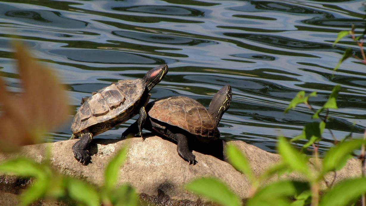 前がクサガメ。後ろがミシシッピアカミミガメ