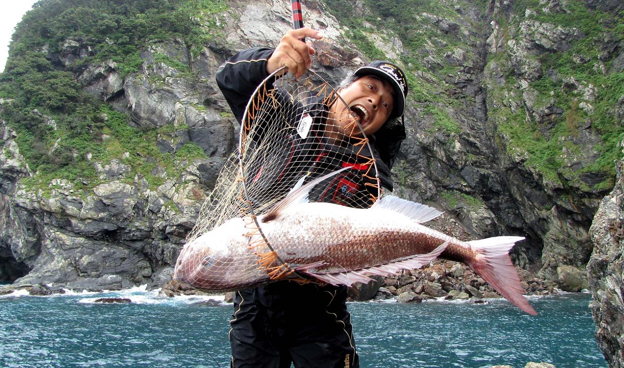 一回目のタモ入れが成功、その直後ウネリでマダイが持ち上げられ、網からマダイがこぼれます。再度挑戦の二回目はウネリの上げ7分目にタモ入れ成功、ウネリの引き波でマダイの頭部が網にすっぽりと収まり、引き上げに成功したのです。