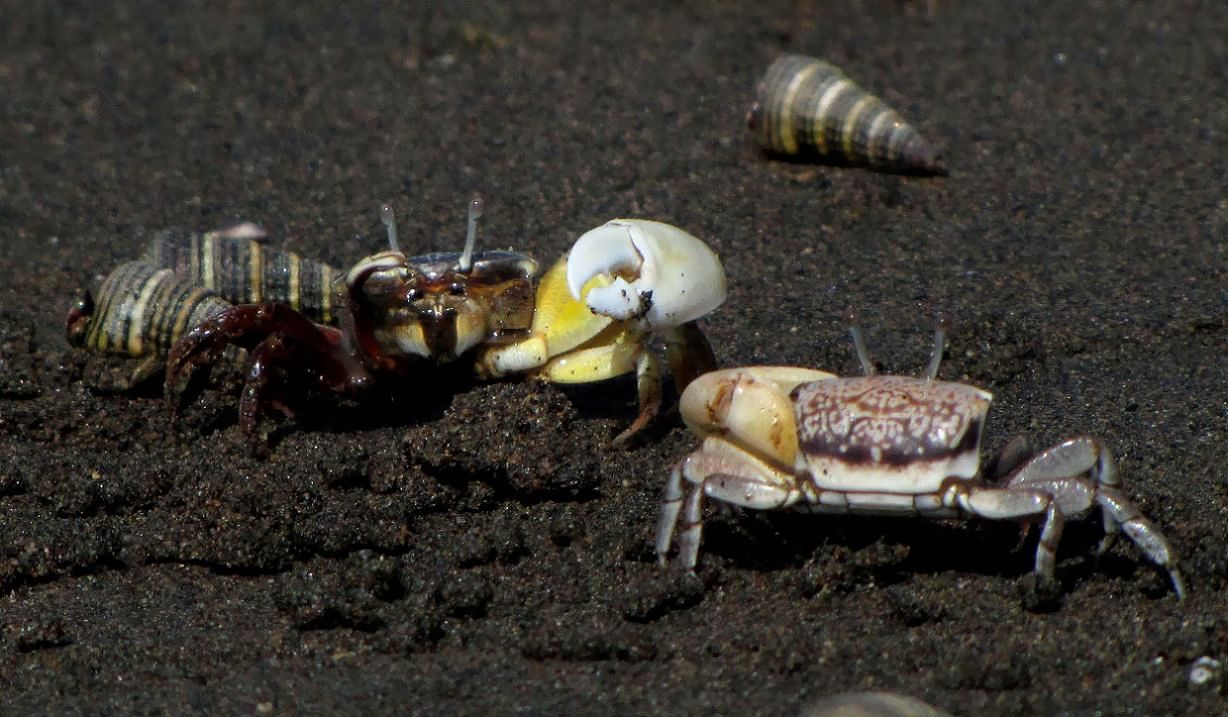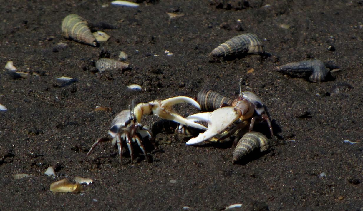 オスは片方のハサミが大きくて、求愛する時には大きく振る仕草を見せます。エサやメスをめぐって喧嘩する時には、大きなハサミでつかみ合いをします。