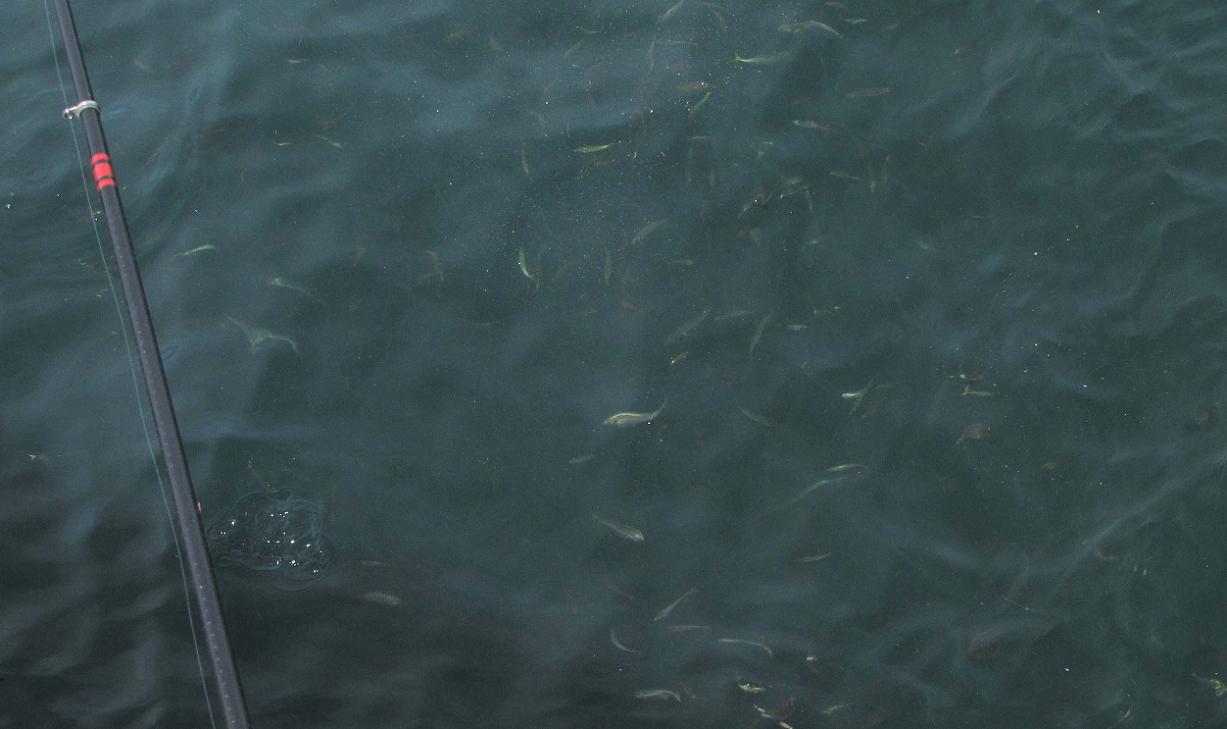 マキエを打つと直ぐにアジゴ、よってエサ取り用のマキエは、波止際の潮上30mに設定しました。本命のマキエは波止から40m沖に設定して狙います。設定した場所の水深は18mくらいです。