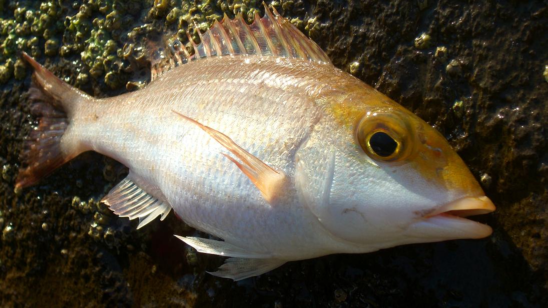 九州では五島列島や甑島などで良く釣れる。フエフキダイ科のお魚さん達の中でも小型の仲間で、25cmくらいしか成長しない。コレは宇久島で釣れたけど、20cmくらいで体側に斑点が出ていなかった。