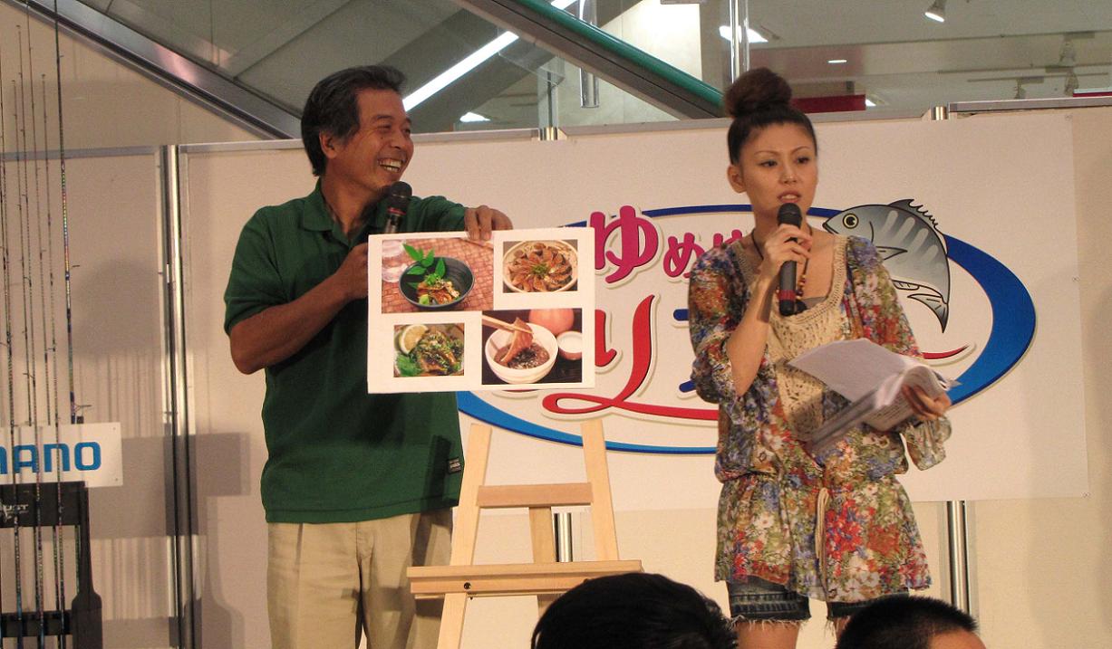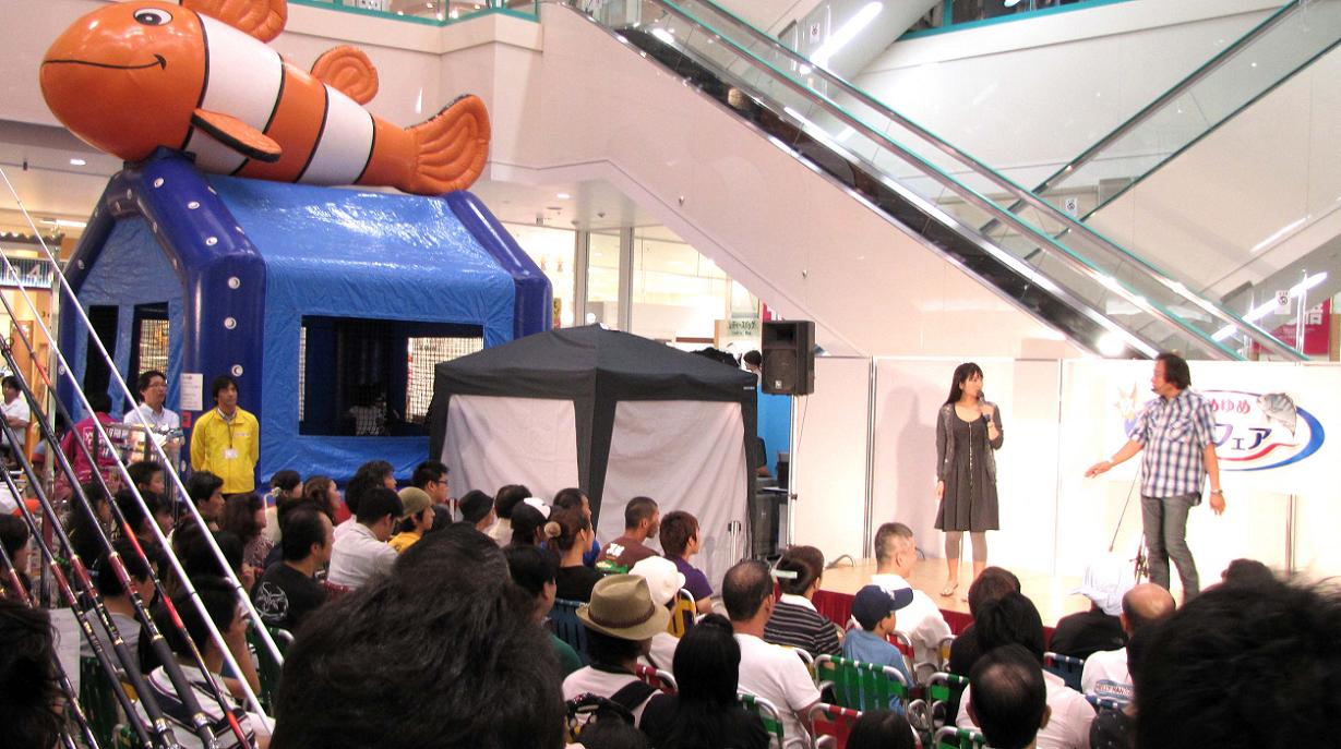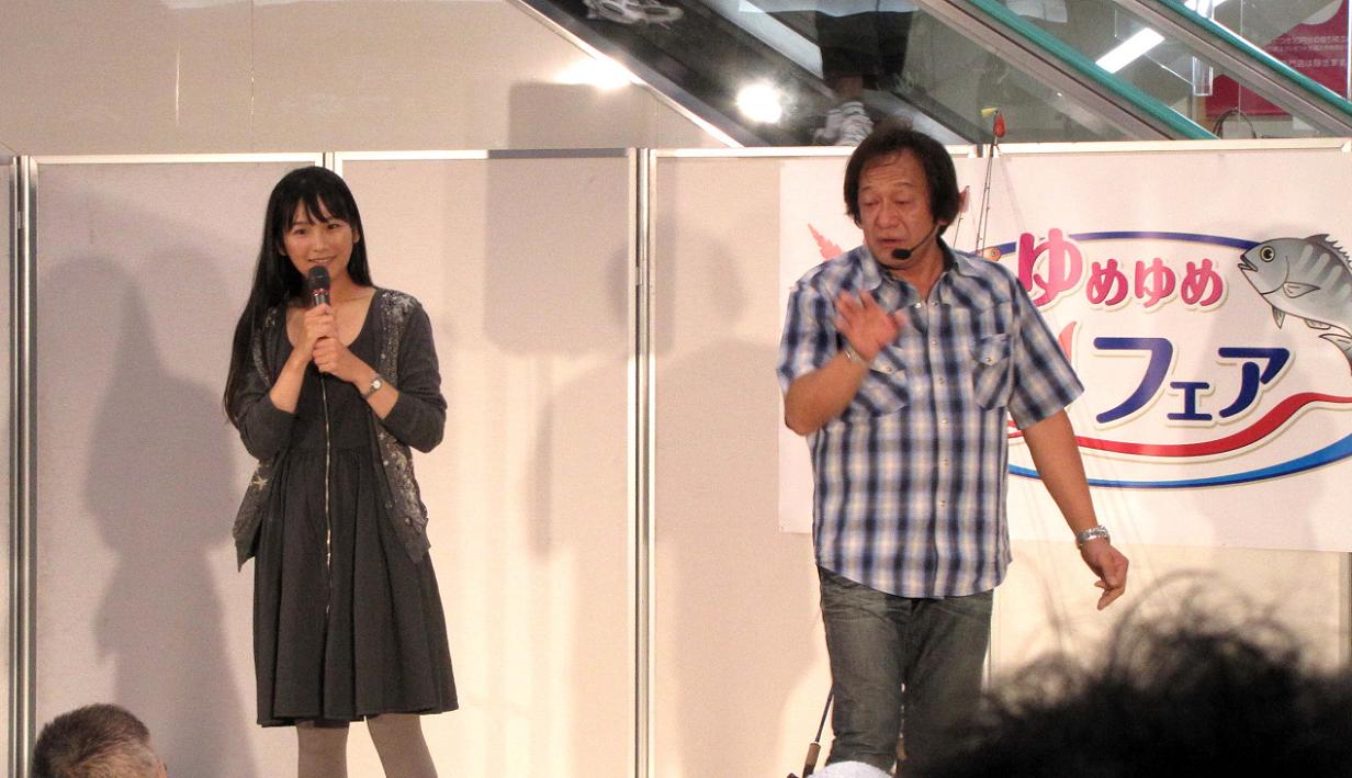 今日はルアー界の帝王、村田基さんと釣りドルの永浜いりあちゃんのトークです。私は初日だけでしたが、二日目と三日目の今日は、ゆめつりキャスターに山田優子さんが来ていたので、友情出演?としてファミリークイズをお手伝い。