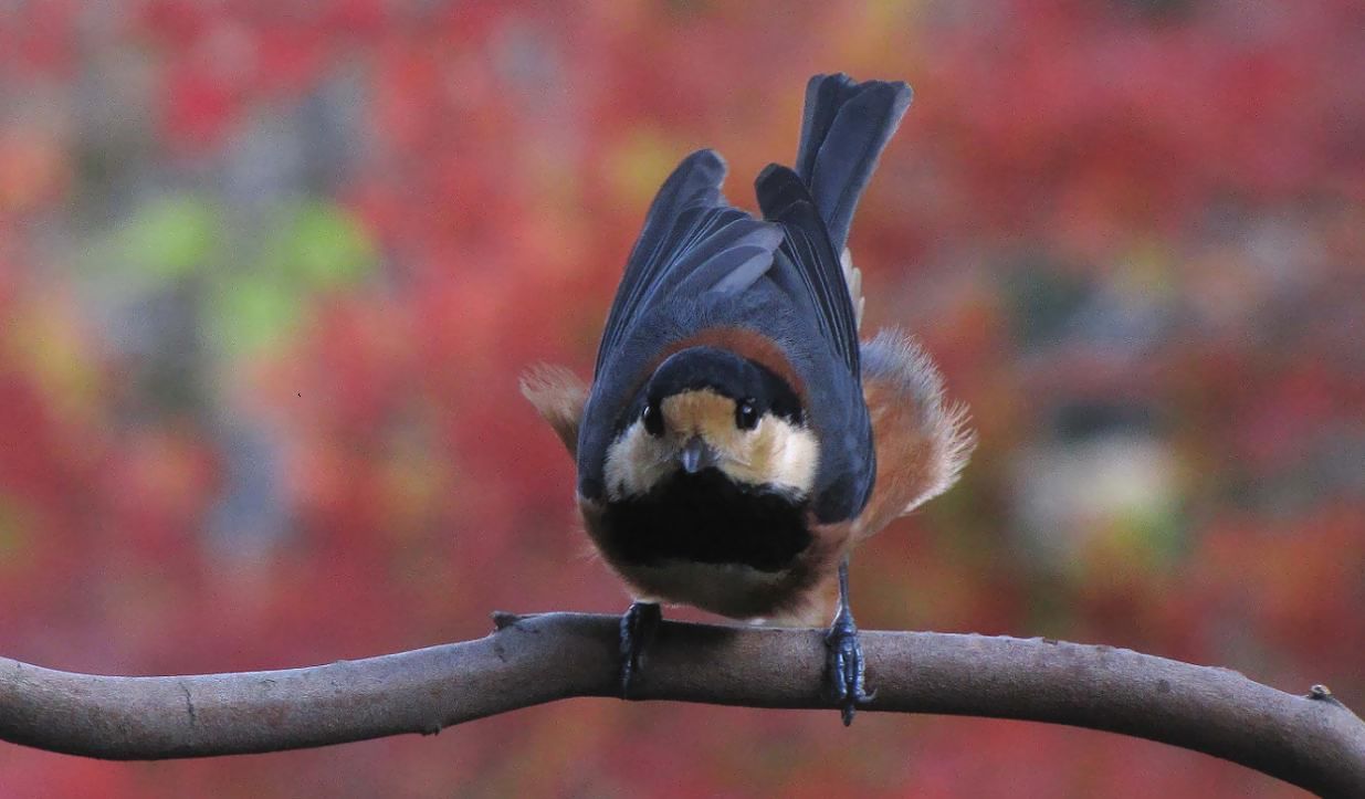 モミジが綺麗な色になっています。今の所2本だけですが、順次赤くなる事でしょう。ヤマガラ達は慣れているので、モミジをバックに色んなポーズ。