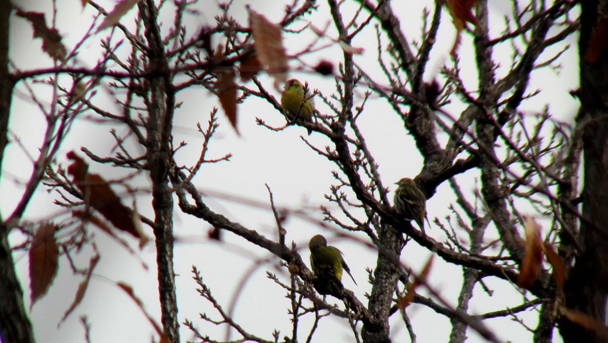 冬鳥として来ている、マヒワのオス2羽とメス1羽
