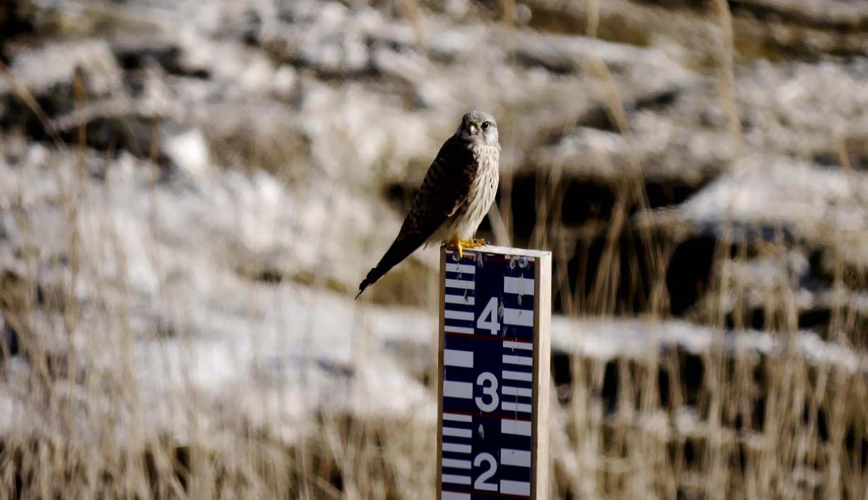 チョウゲンボウの全長はオスで33cm、コチョウゲンボウのオスの全長は29cm、水位計の上に留まったのを確認すると、29cm~30cmの大きさです。この大きさからコチョウゲンボウのオスと判断しました。