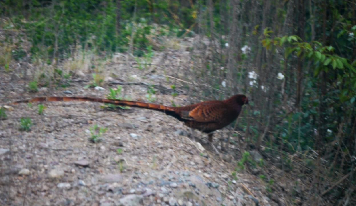 朝一番のヤマドリは留鳥、暗い中フロント越しで写しました