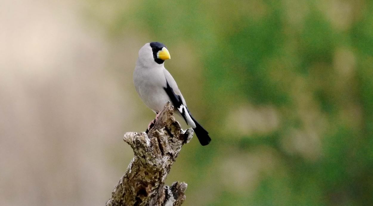 シメは大陸から来る冬鳥で、尾っぽが短くてイカルよりも小さい。