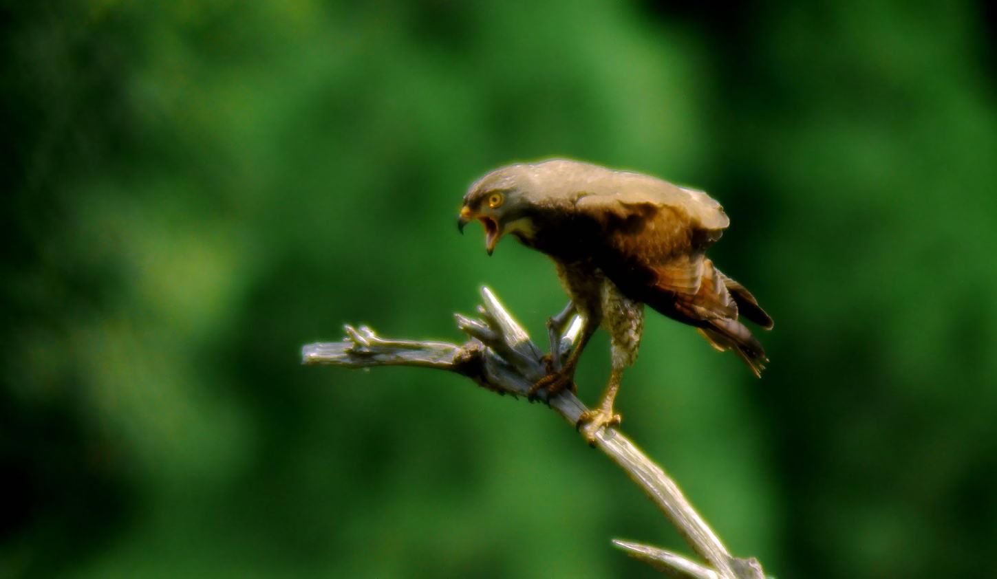 12時過ぎ、枯れ木の見える藪の中から見ていたら、メスが枯れ木に居て、巣の有る方からオスの鳴き声が聞こえていた時、2羽のサシバが仲良く飛んでいました。合計4羽です。雛は今日巣立ったのです。