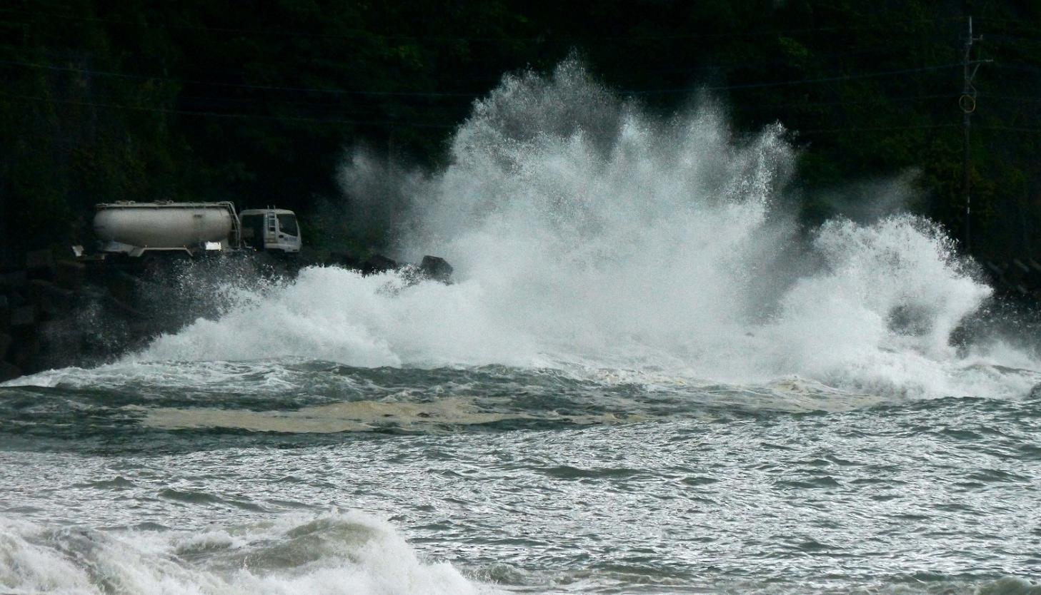 通行中の車は、屋根の上から波しぶきを受けます