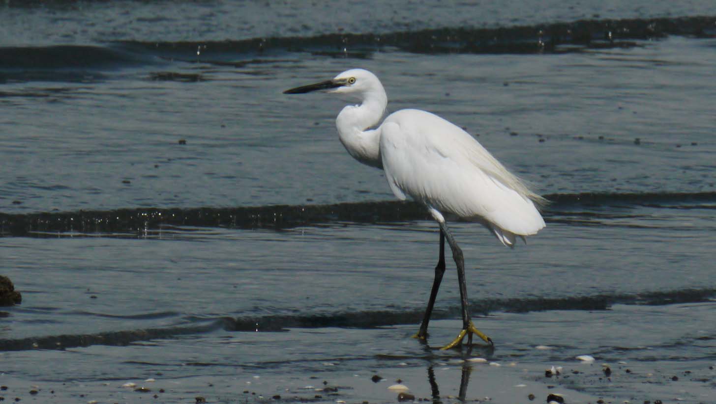 でもホウロクシギは、お構いなしに近くでエサを啄ばみます。キアシシギも群れでエサを獲っています。後から2羽のコサギも近くに来ました。