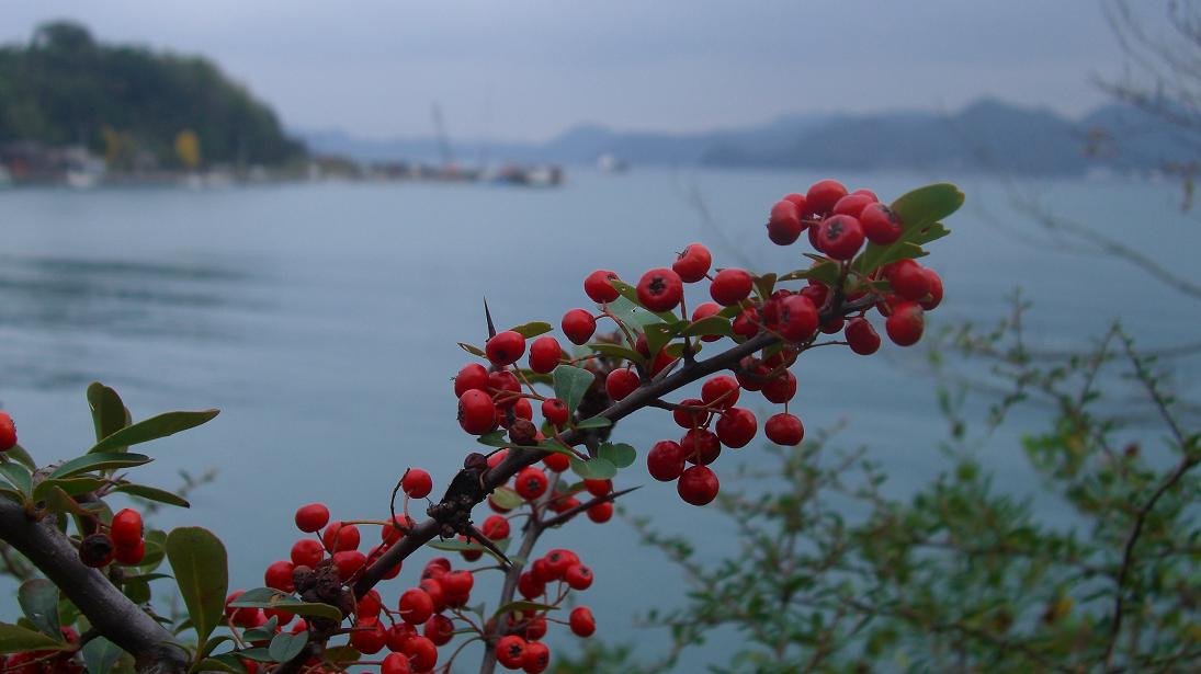 あとはお決まりの撮影。海をバックに写した中のピラカンサ。赤と橙の2種類が野生化していた。ピラは棘の意味があり、カンサは赤の意味だったと記憶している・・?