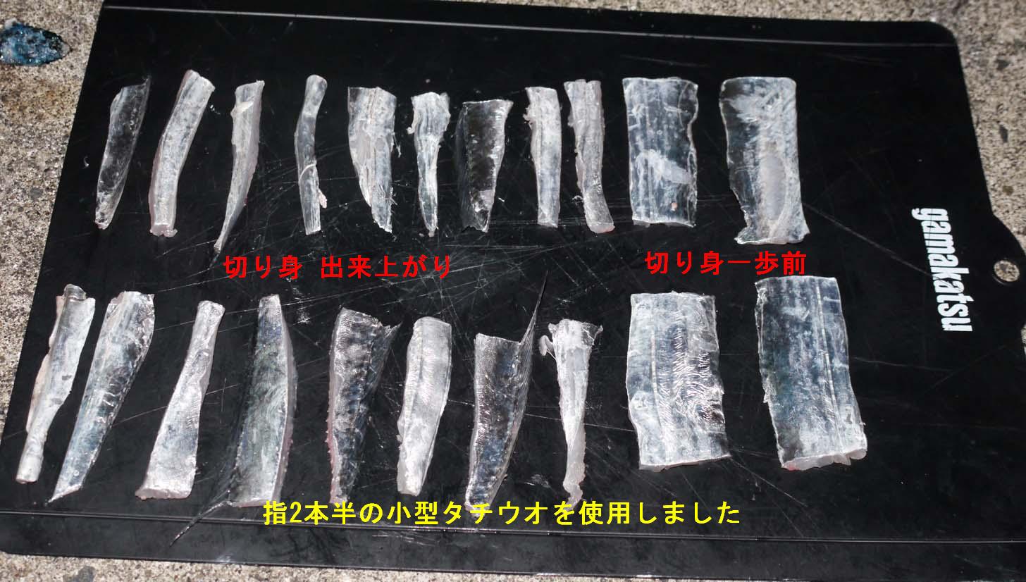 釣れたタチウオの切り身は光るのでアピール力が強い。皮が強いので、キビナゴに比べると断然エサ持ちが良い。食い込みが良い。などのメリットがあるのです。