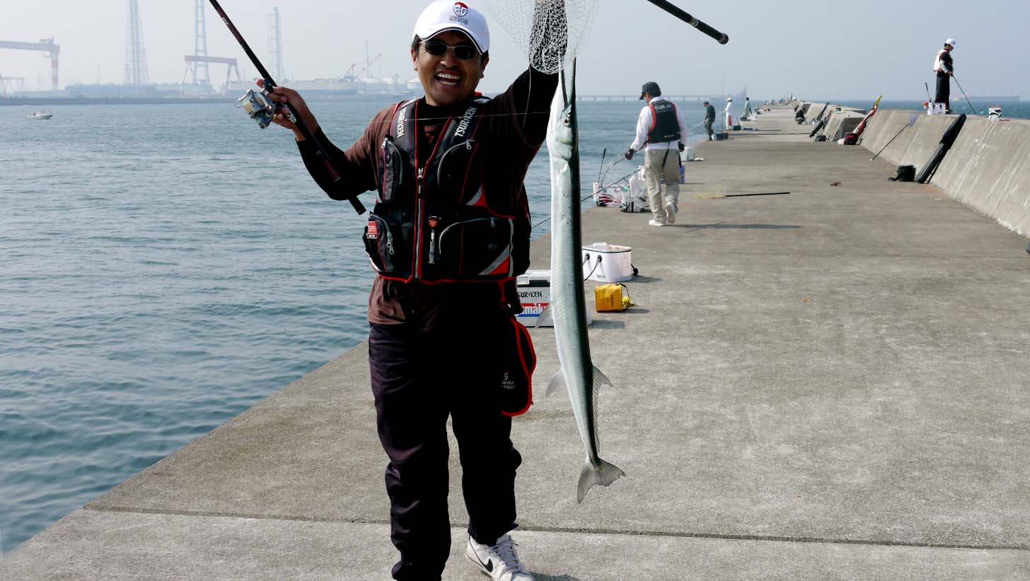 泳がせ釣りでヤズを狙っていた久保平君、最後に掛けたのは特大ダツ。