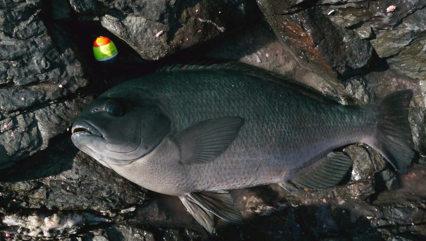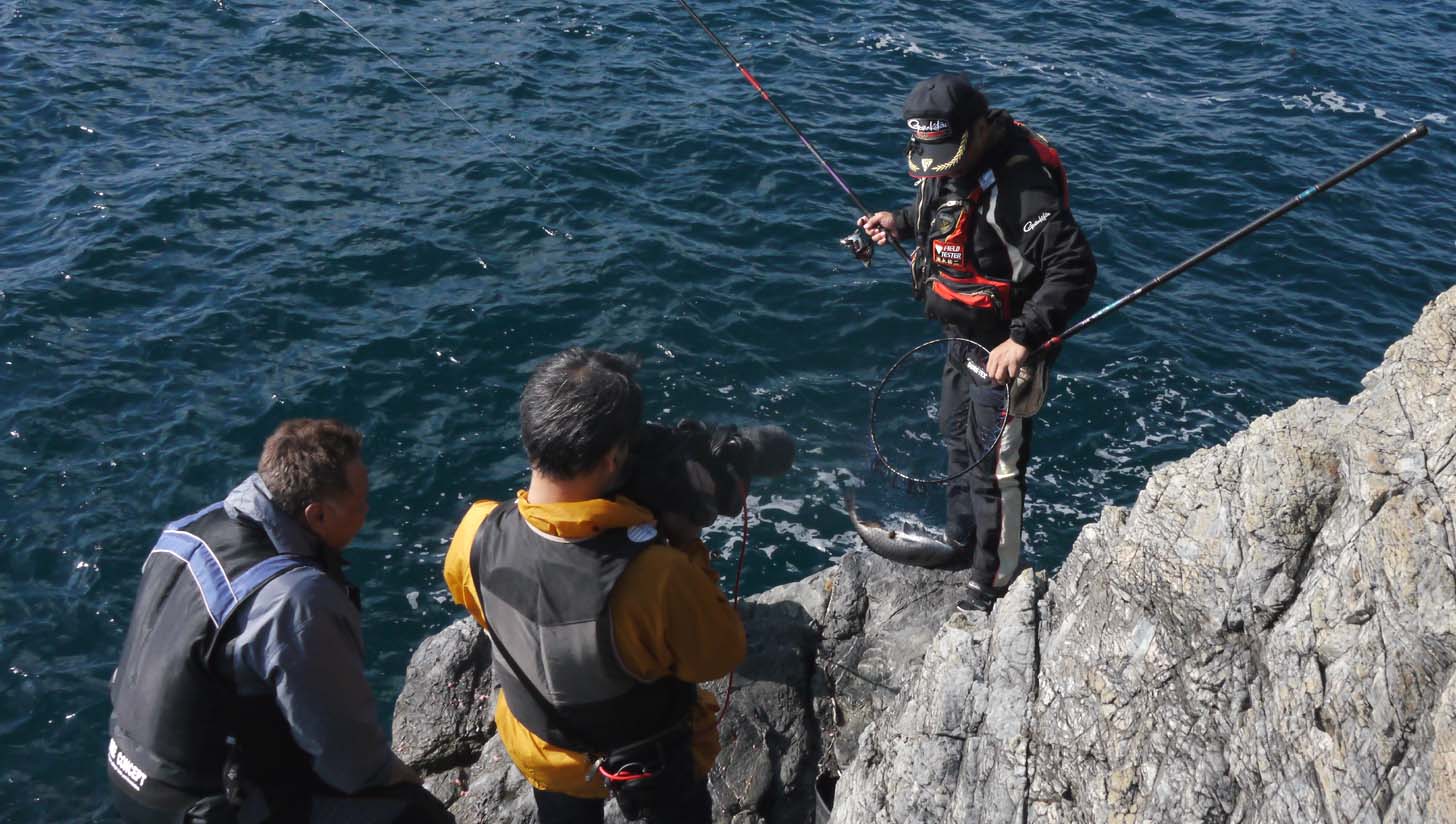一投目、手前の本流に道糸を取られます。ガン玉Bを取り付け第二投、30cm弱のグレが初ヒット、サイズアップを狙って三投目、目測48cmの本日最大となるグレが躍り出ました。これでエンディング、Dに竿を貸してグレを1匹釣ってもらい、磯での釣りの取材は成功になったのです。