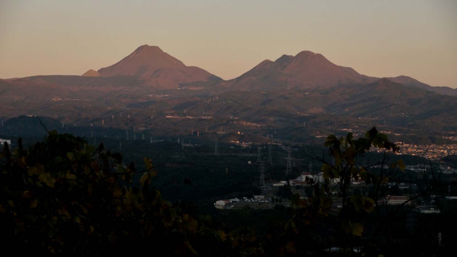 北西に見える鶴見岳と由布岳に綺麗な朝日。