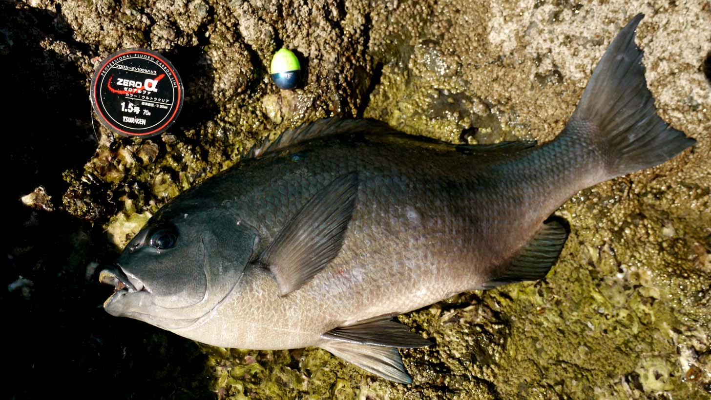 エサ取りは比較的少なく、磯際にスズメダイとネンブツダイを集めて、20mほど沖を狙うとコンスタントに30cm前後のグレが釣れてきます。喰っているタナは1ヒロ前後と非常に浅く、釣ってはリリースの繰り返し。
