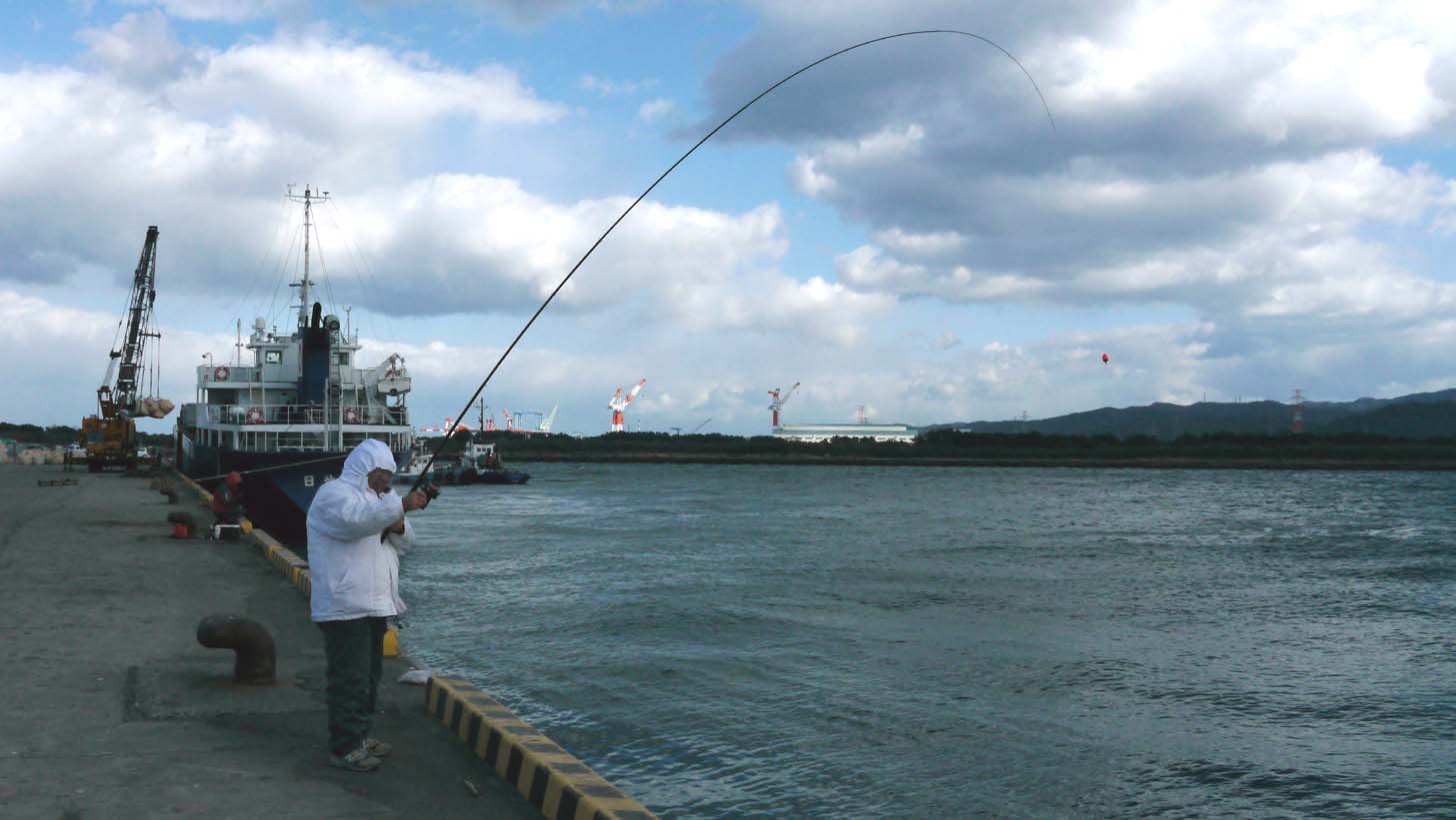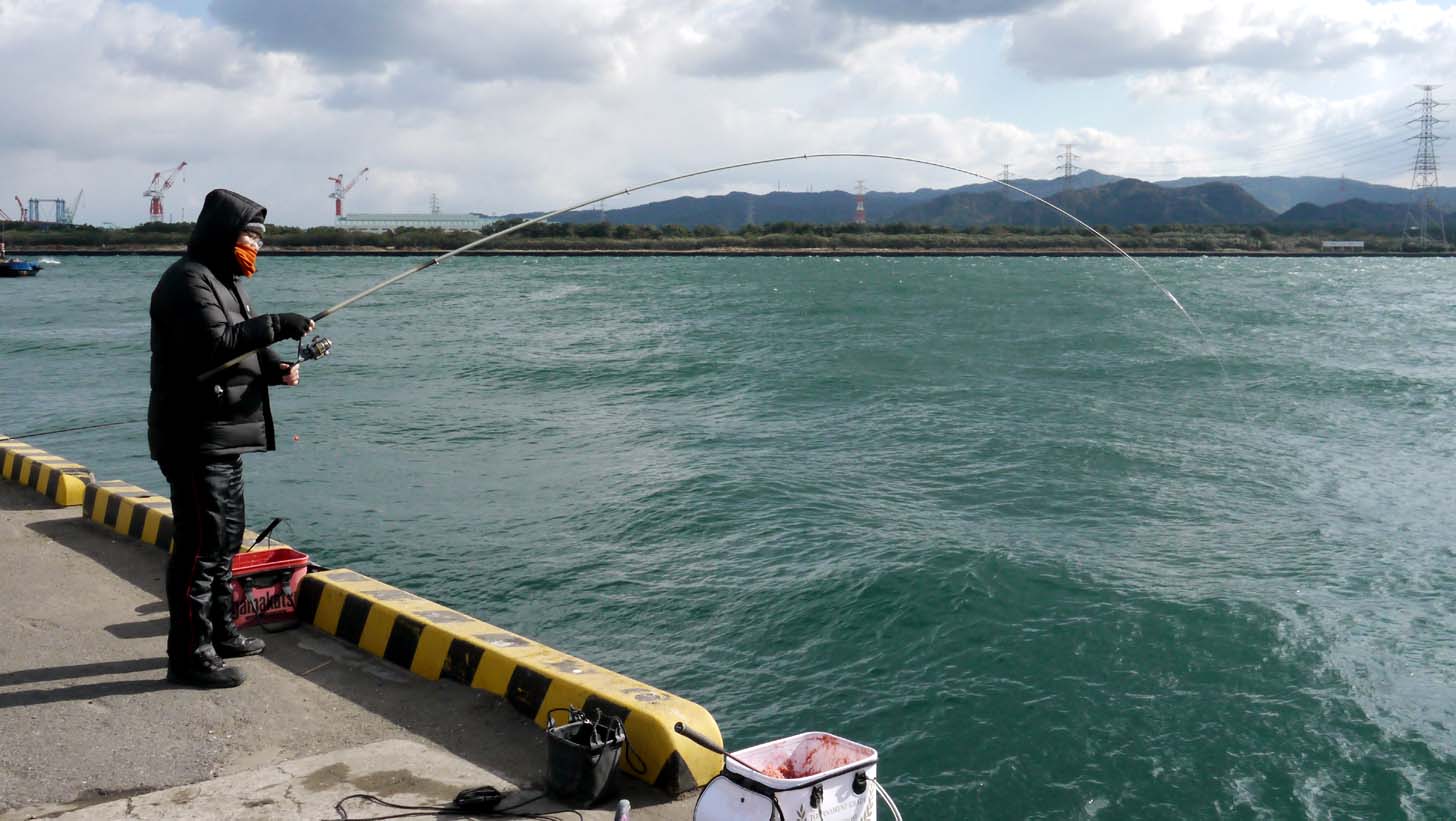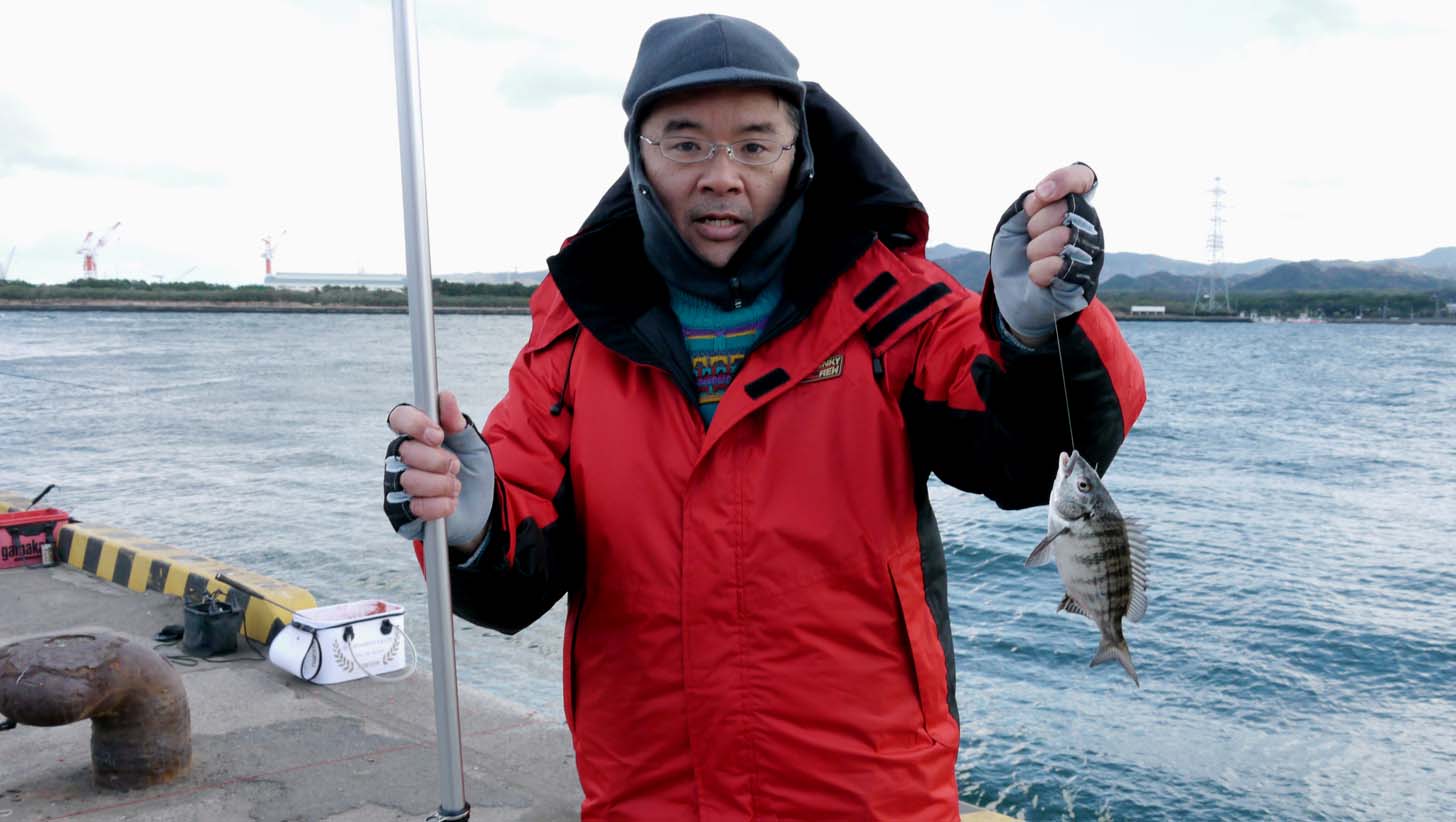初心者コースは防波堤からのチヌ釣り。北西風を避けてポイントに選んだのは、大在公共埠頭の通称“砂置き場”。水深は6m前後と比較的浅場です。