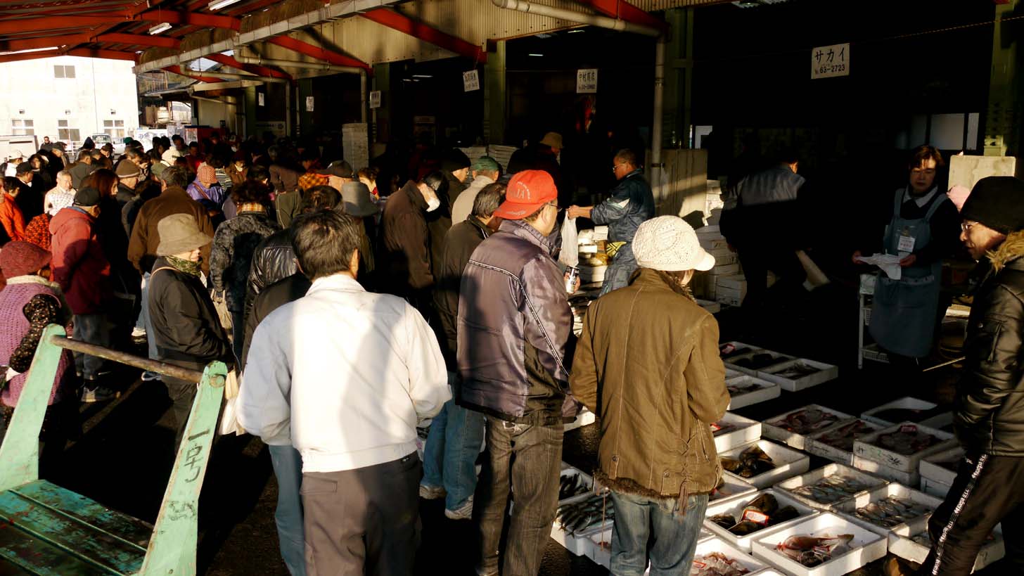 年末の競りは普段より多い人だかり、熱気にあふれています