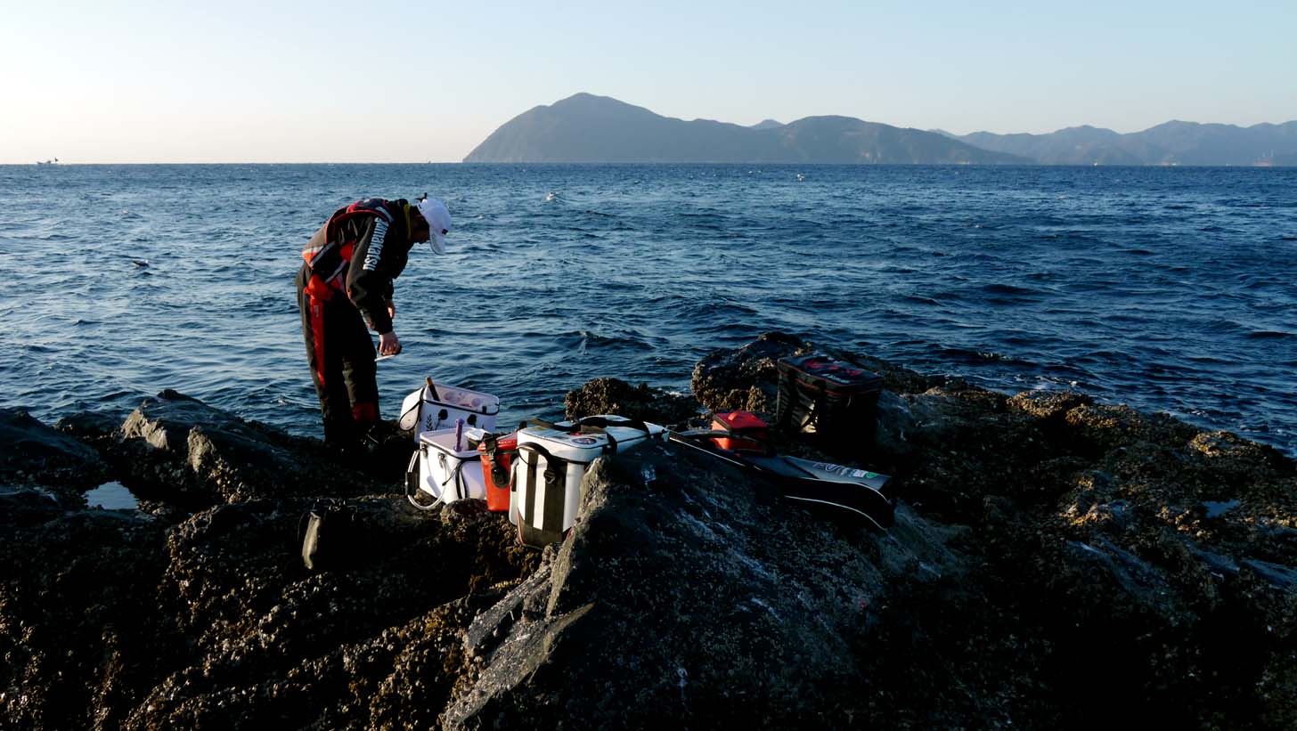 木村君は西側の下げ本流、私は東側の下げ本流に釣り座を構えました。この磯の本命潮は下げ潮で、今日は12時頃まで流れる予定。本命の釣り座は西側ですが、北西風を正面から受けるので、年寄りの私は行きません。