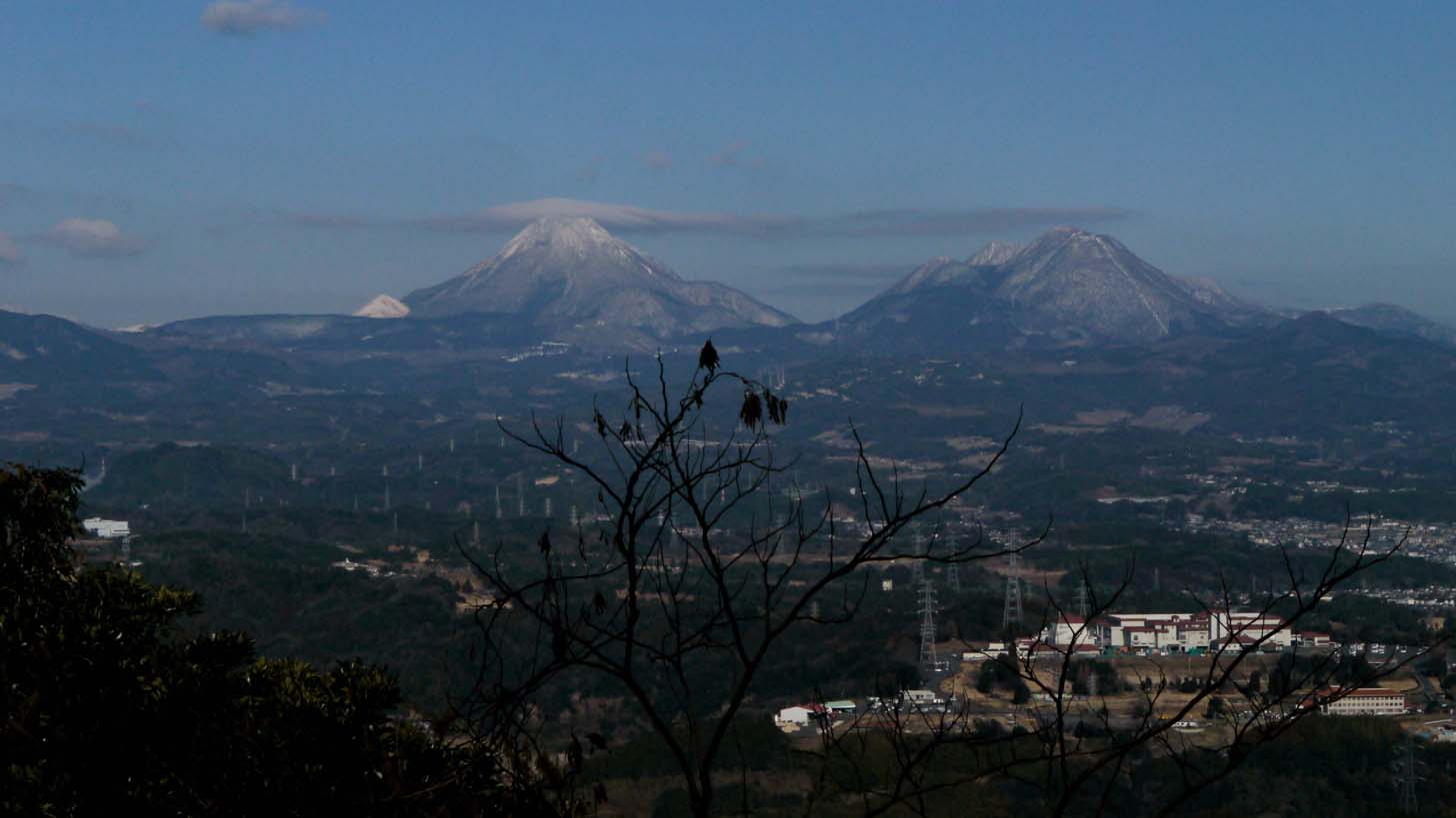 朝の由布岳(豊後富士)と鶴見岳(右)