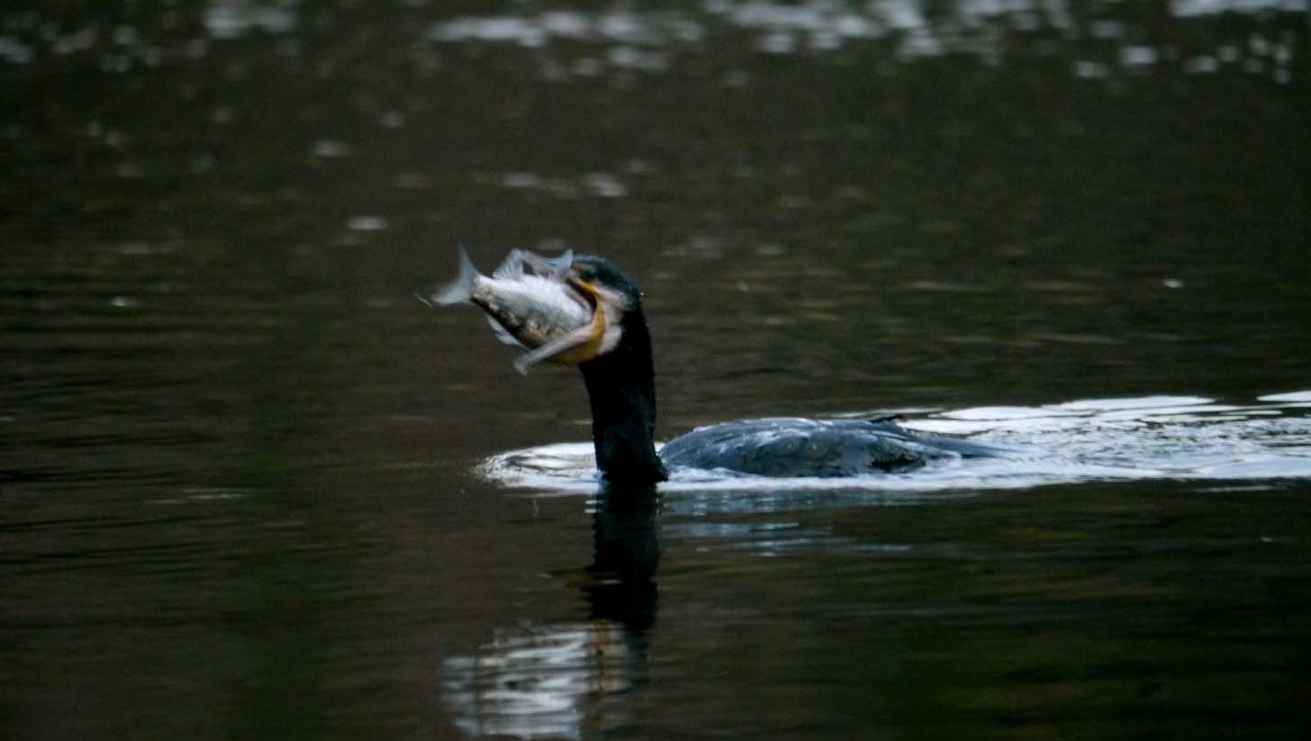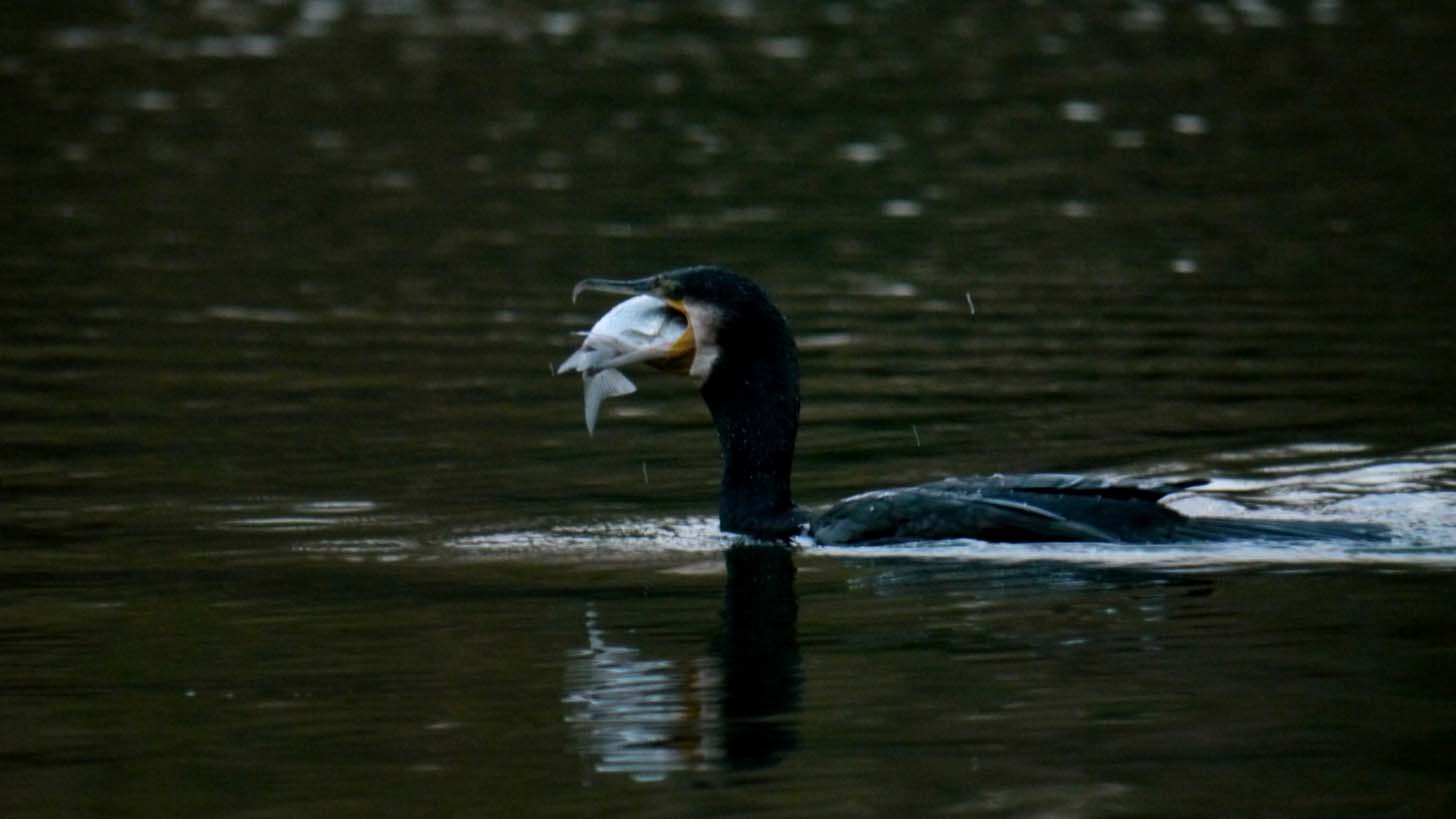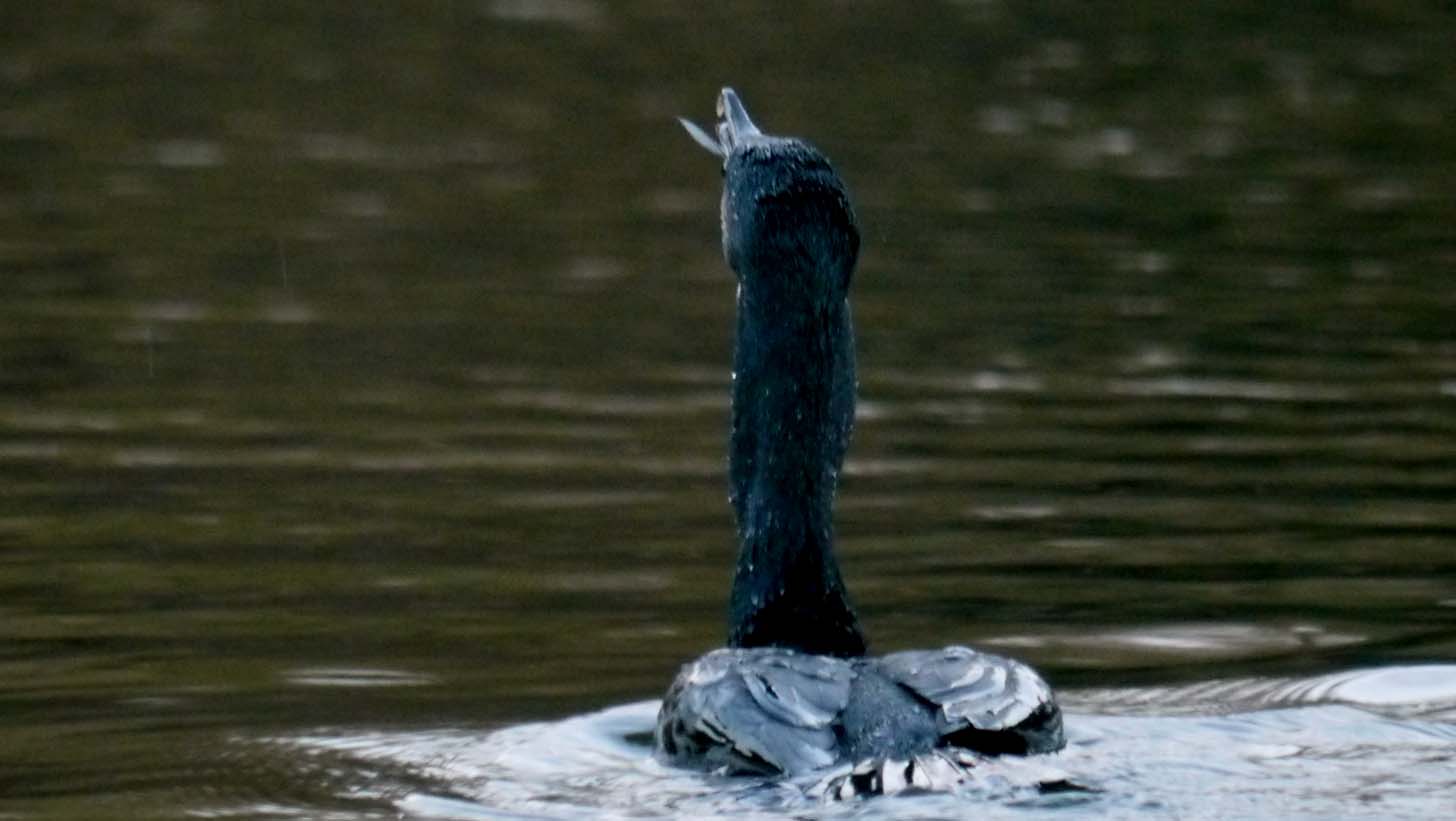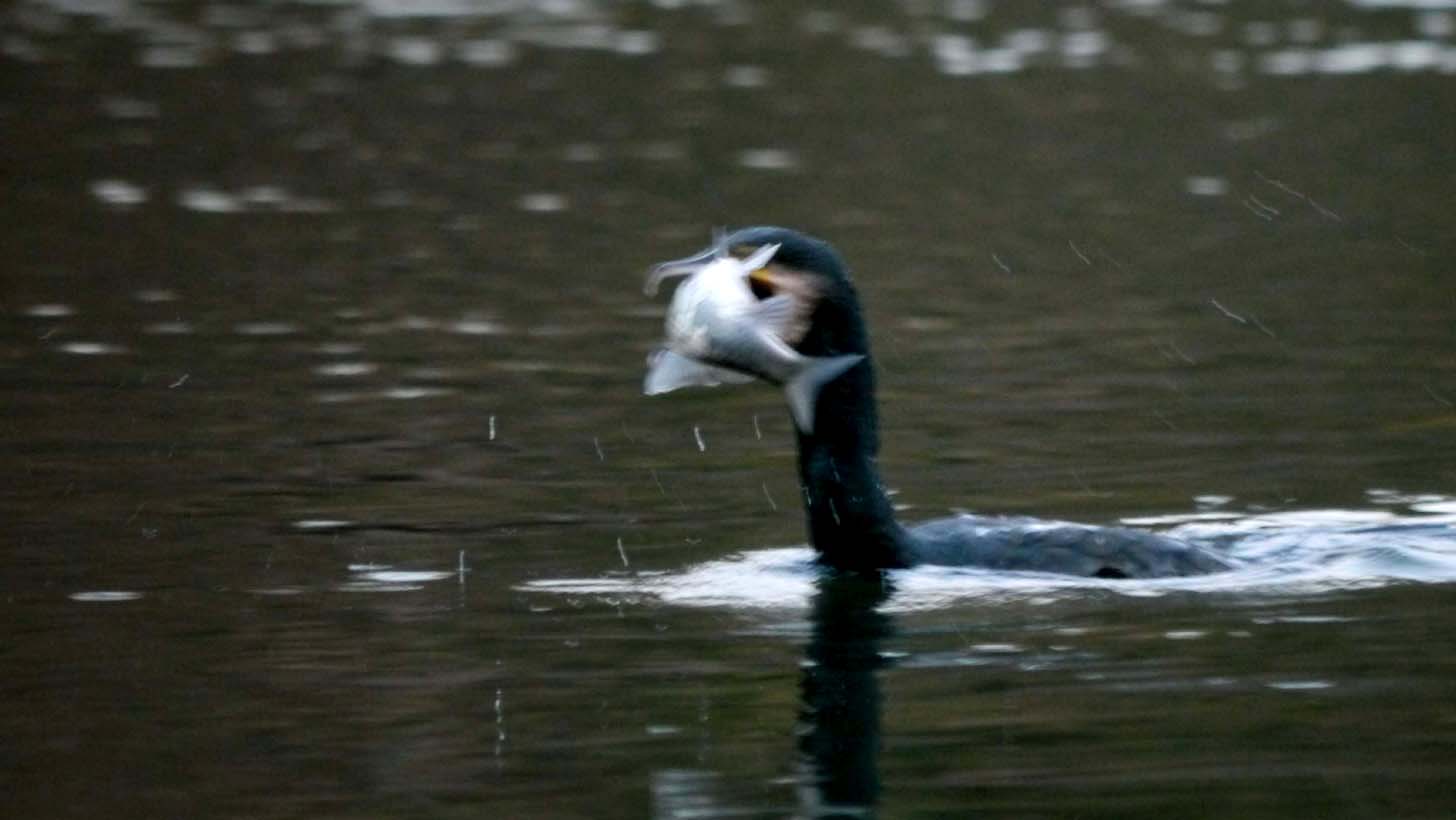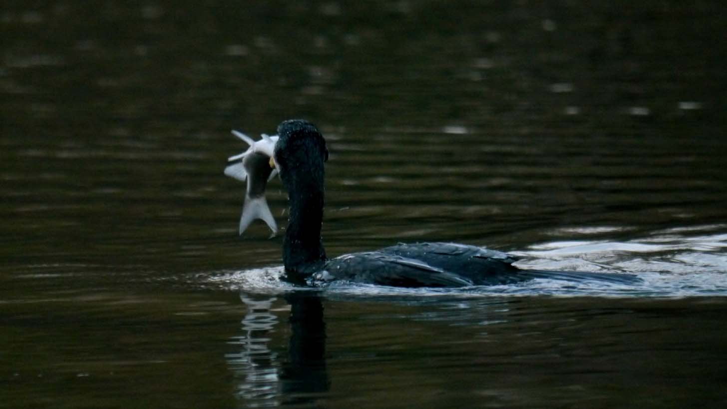 池でカワウが狩りをしています。