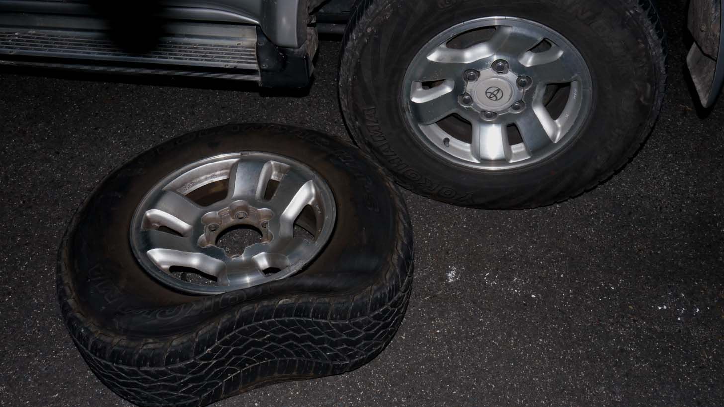 トンネルを抜け、宮川内インターの出口1kmほど手前で、左側から「サラサラサラサラサラ・・・」と車道外側線を踏んだ様な異音が始まりました。嫌な予感がしたので減速します。すると車は少しずつ左に傾きはじめました。