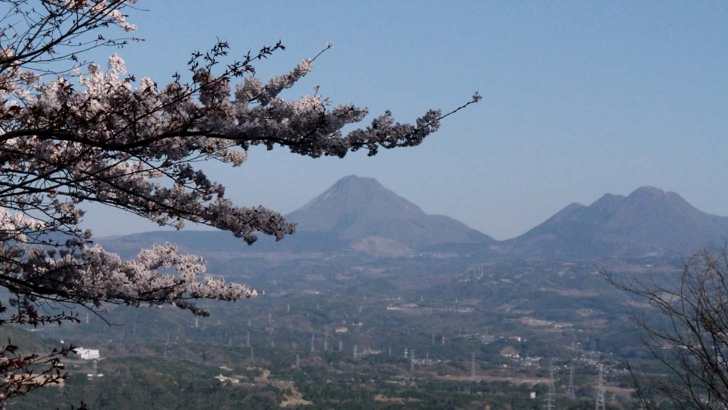 ソメイヨシノと由布岳(左)、そして鶴見岳