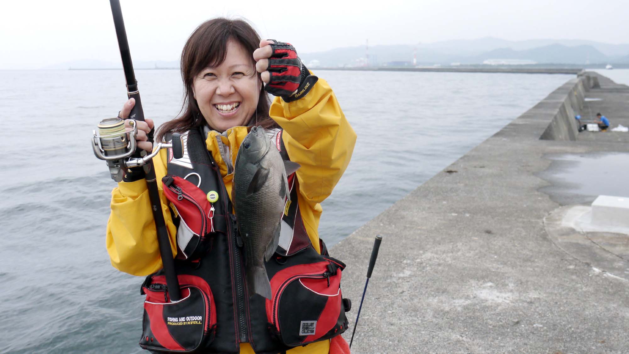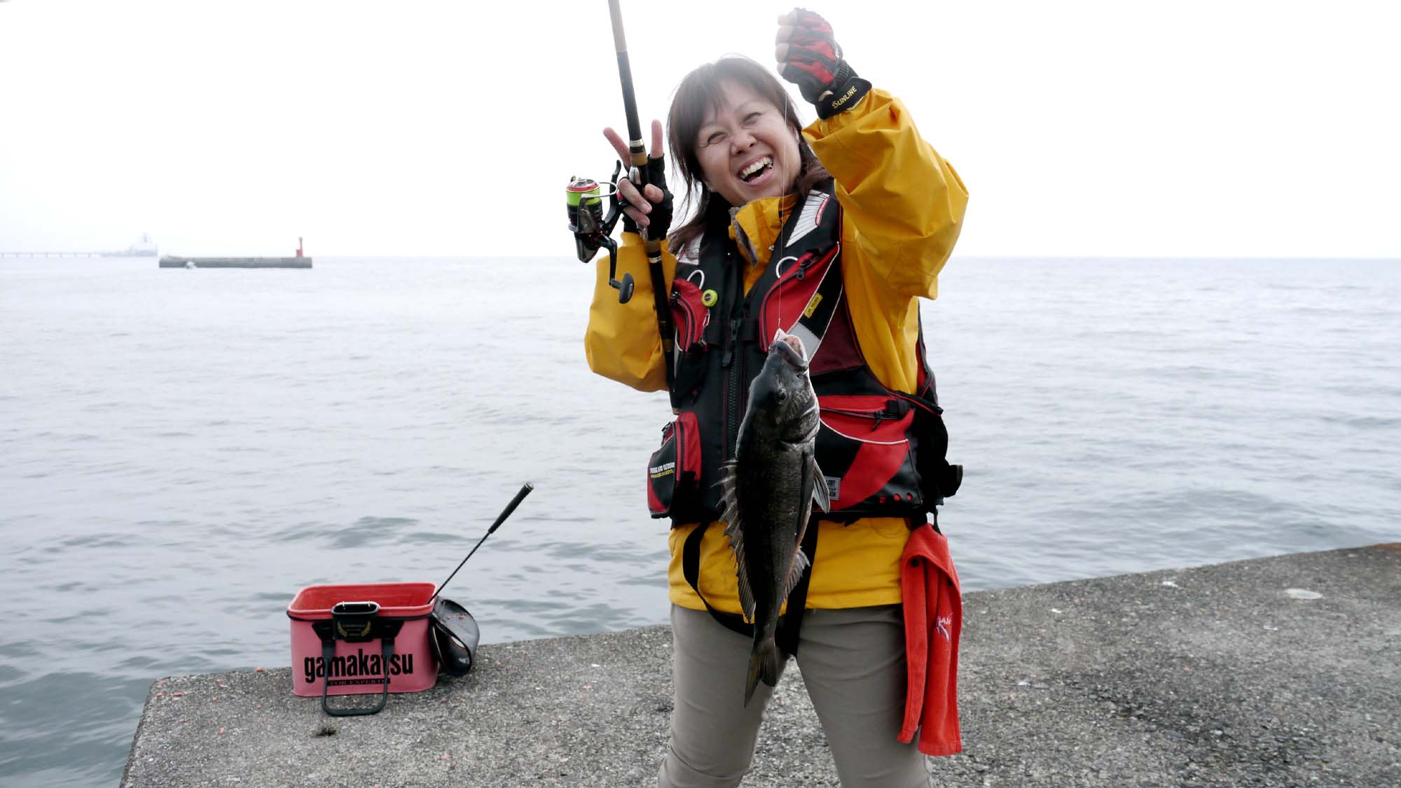 釣り場所は横一文字の白灯台。ほぼ引き潮の時間帯で竿を振って、25㎝~30㎝級のマダイやチダイ、更にはグレとチヌなどの収穫です。
