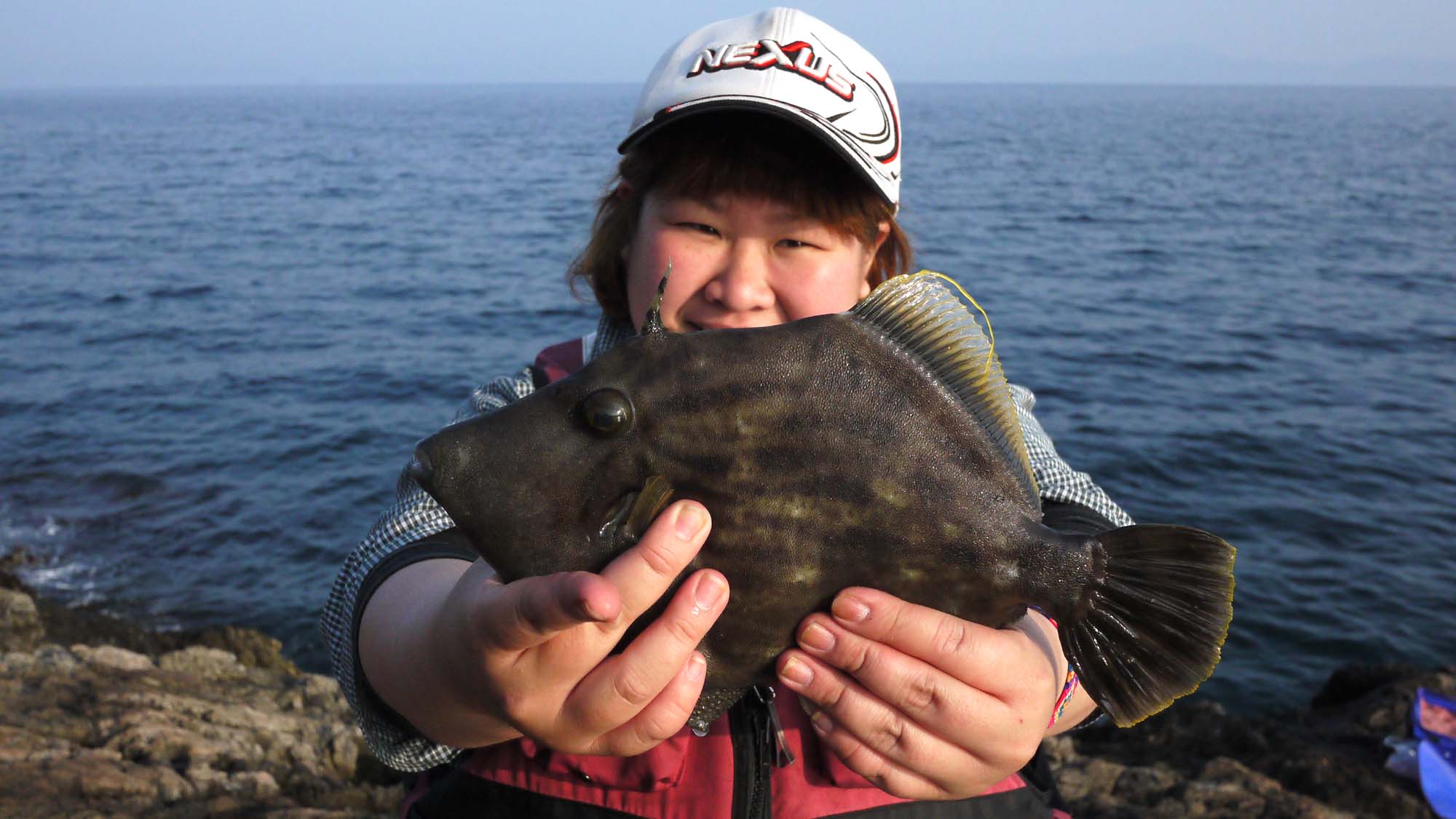 磯釣り最初の獲物は良型のカワハギ、結構引きました