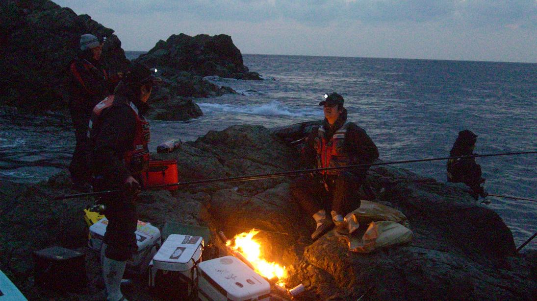 しかも朝5時には磯に到着してしまい、夜釣りをする人も・・・オレ達はオガライトで暖を摂りながら朝を迎えた。ちなみに夜釣りではアジが少しだけ(^^♪