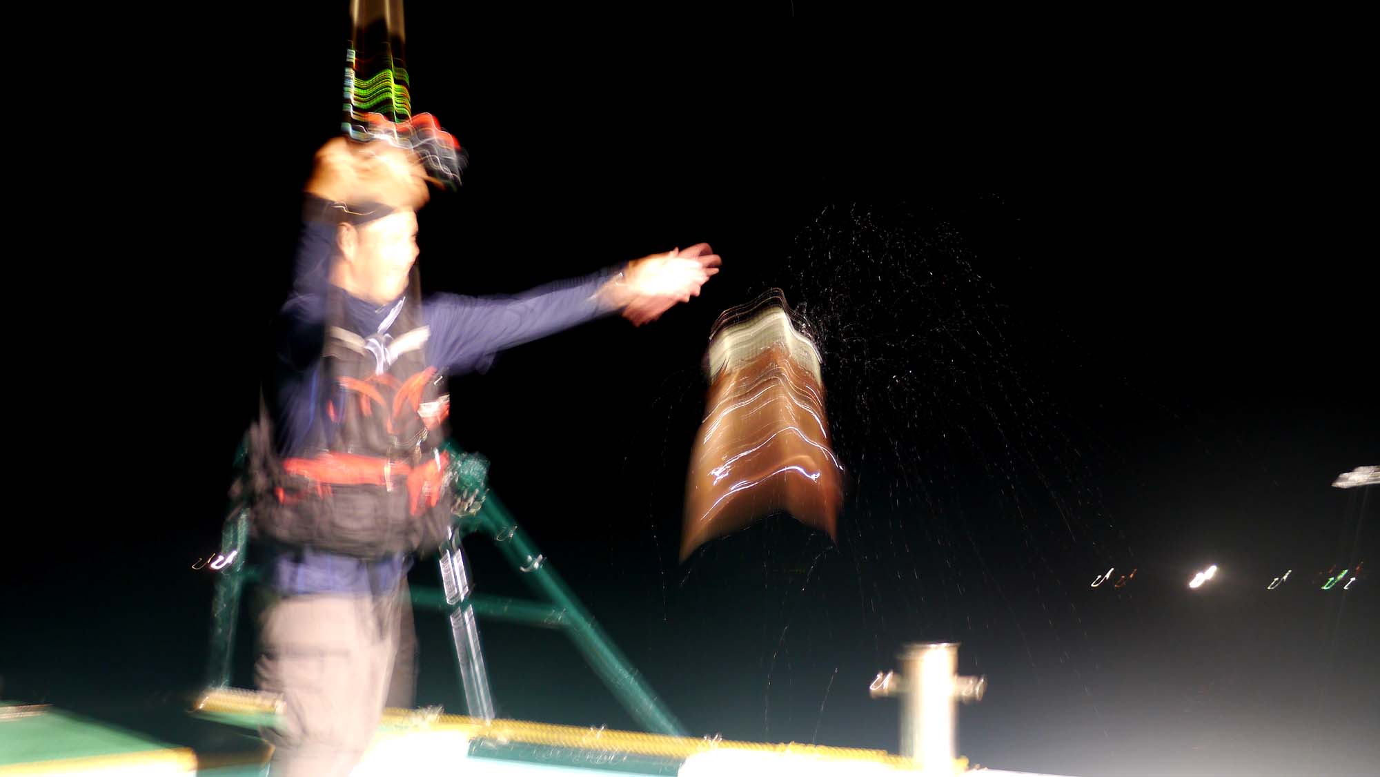 私たちは船で沖へ出て、渋糸にスッテが付いた仕掛け(手ヤマ)を使って狙ったり、リールと竿を用いて、アジゴをエサにしたイカ釣りを楽しんでいます。