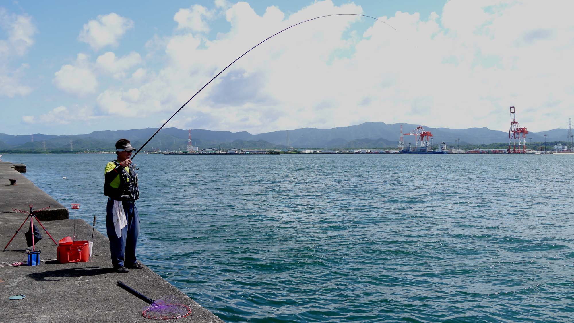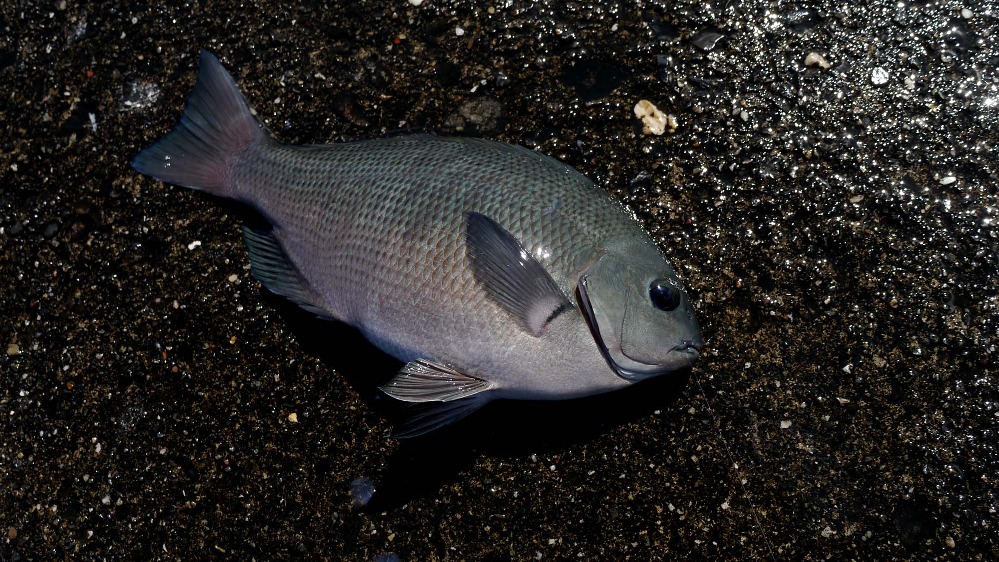 圧巻は1枚のバラシ、灯台外側の満ち潮で、竿一本程度の深さで道糸が伸び始め、アワセを入れるとかなりのスピードで、ほぼ一定の速さを保って海面近くを、対岸の国東半島方面へ休むことなく走り続け、1.5号ハリスをブチ切った魚。
