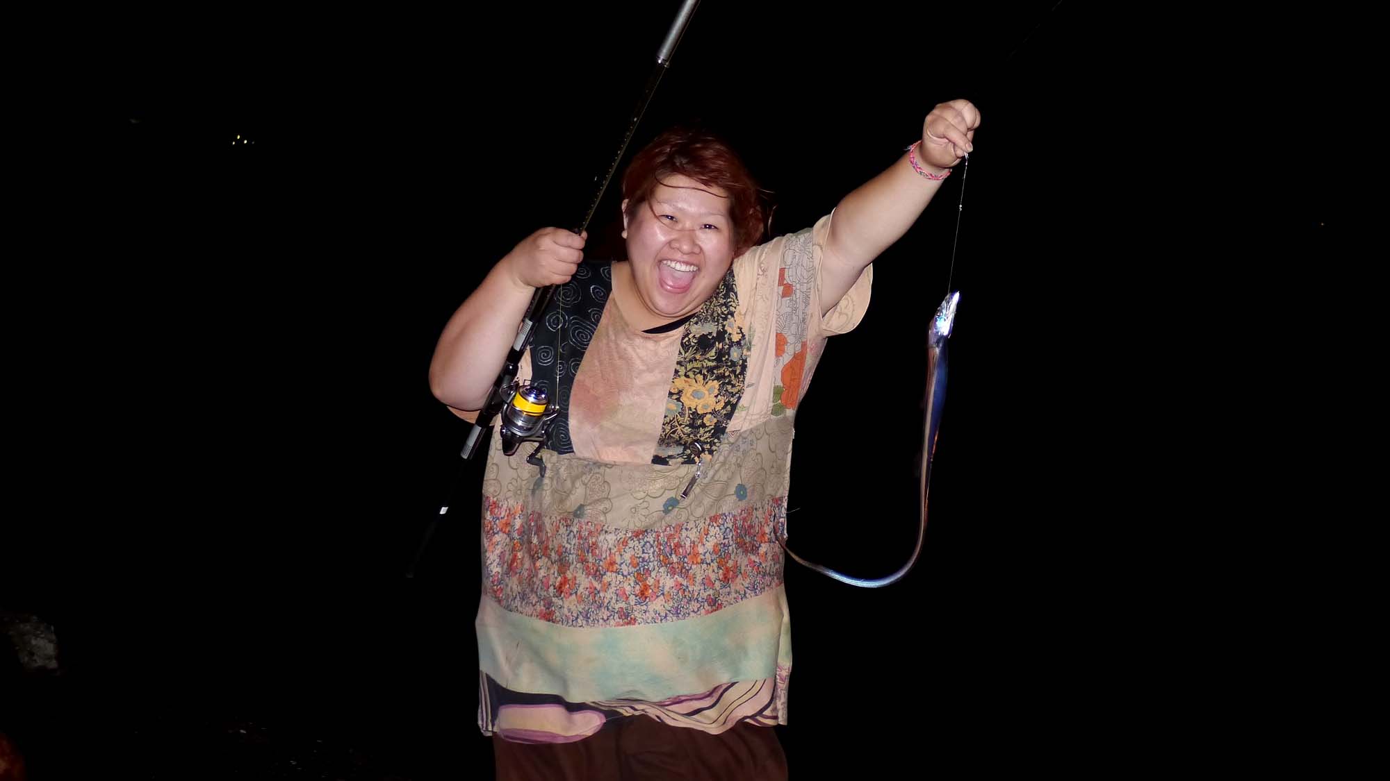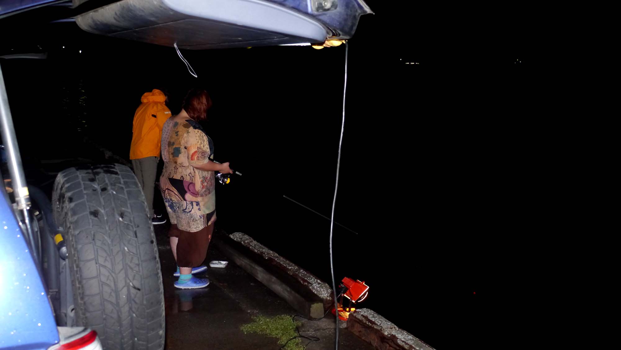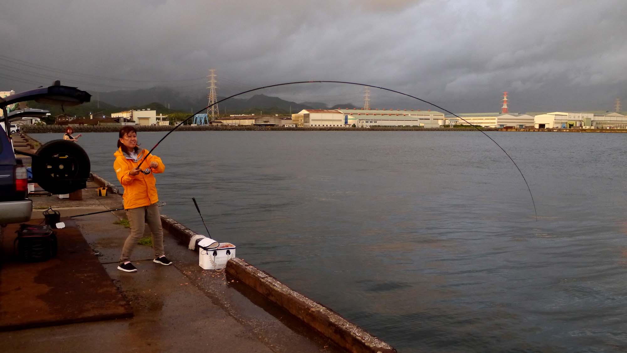 安全を期して、沖の防波堤を避け、後ろからの追い風を受けながら釣りが出来る、日吉原公共埠頭で夜釣りを開始。狙いは太刀魚で、女性陣は灯光器の周りで粘ります。私は車で仮眠を摂り、雨の音で時々目が覚めます。朝方に指3本級の太刀魚が2本ほど釣れて朝マズメとなりました。