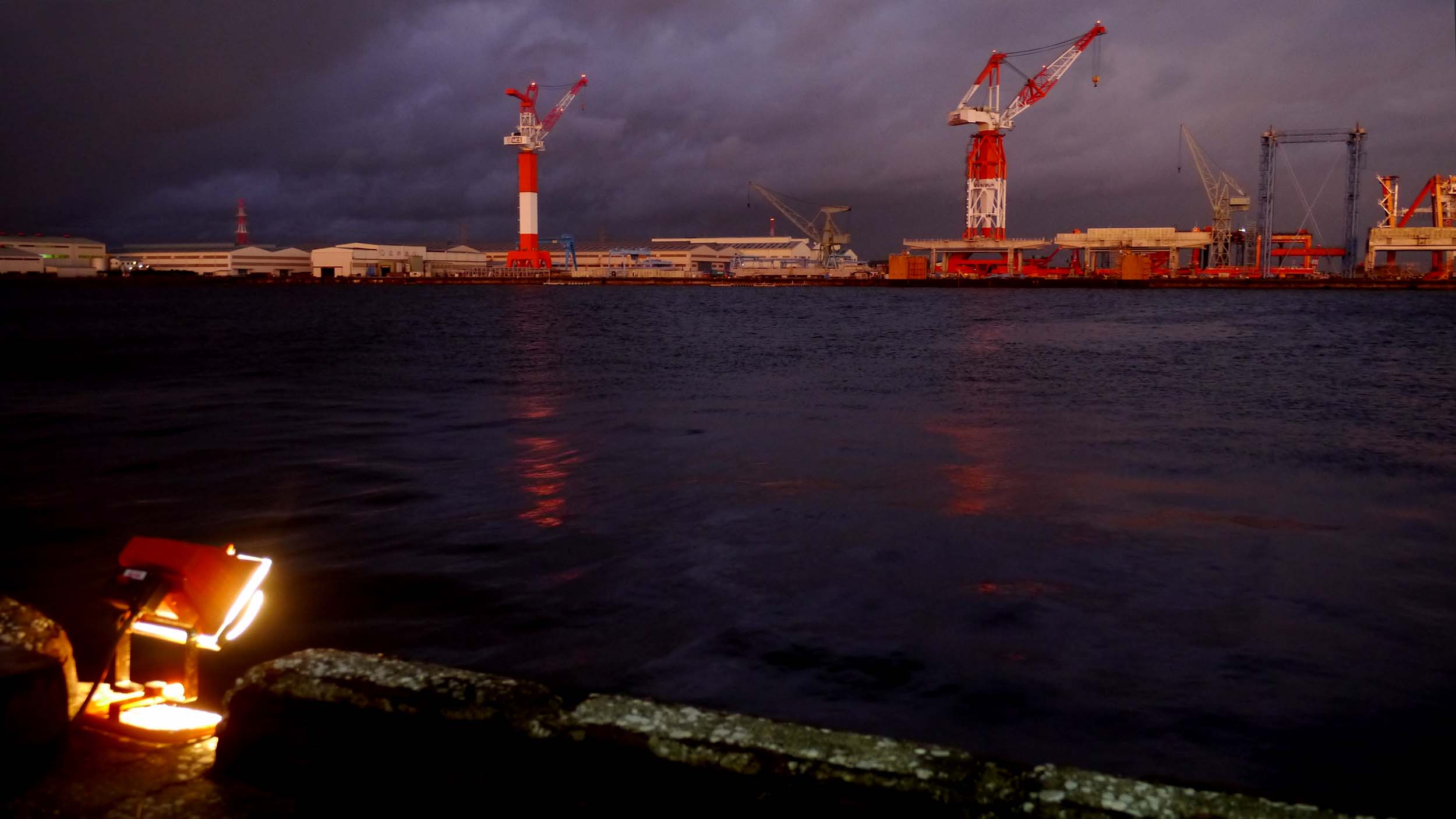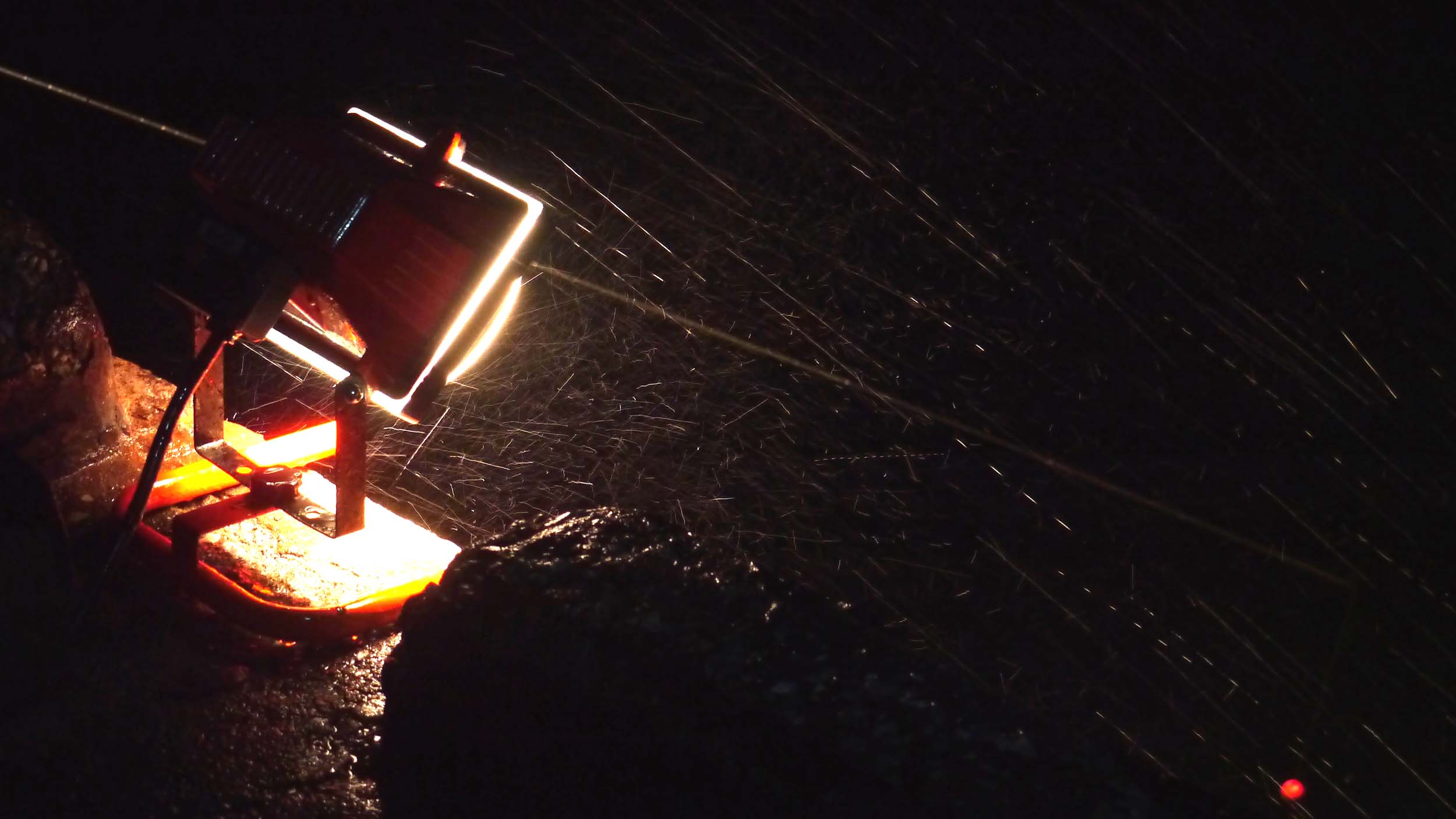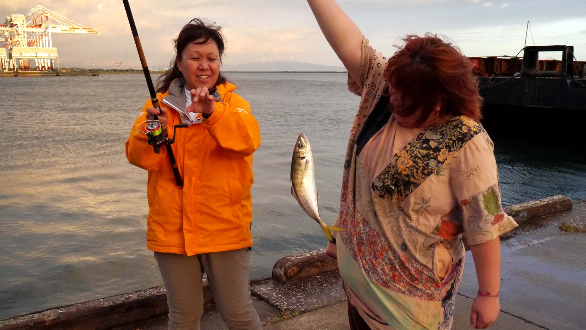 安全を期して、沖の防波堤を避け、後ろからの追い風を受けながら釣りが出来る、日吉原公共埠頭で夜釣りを開始。狙いは太刀魚で、女性陣は灯光器の周りで粘ります。私は車で仮眠を摂り、雨の音で時々目が覚めます。朝方に指3本級の太刀魚が2本ほど釣れて朝マズメとなりました。