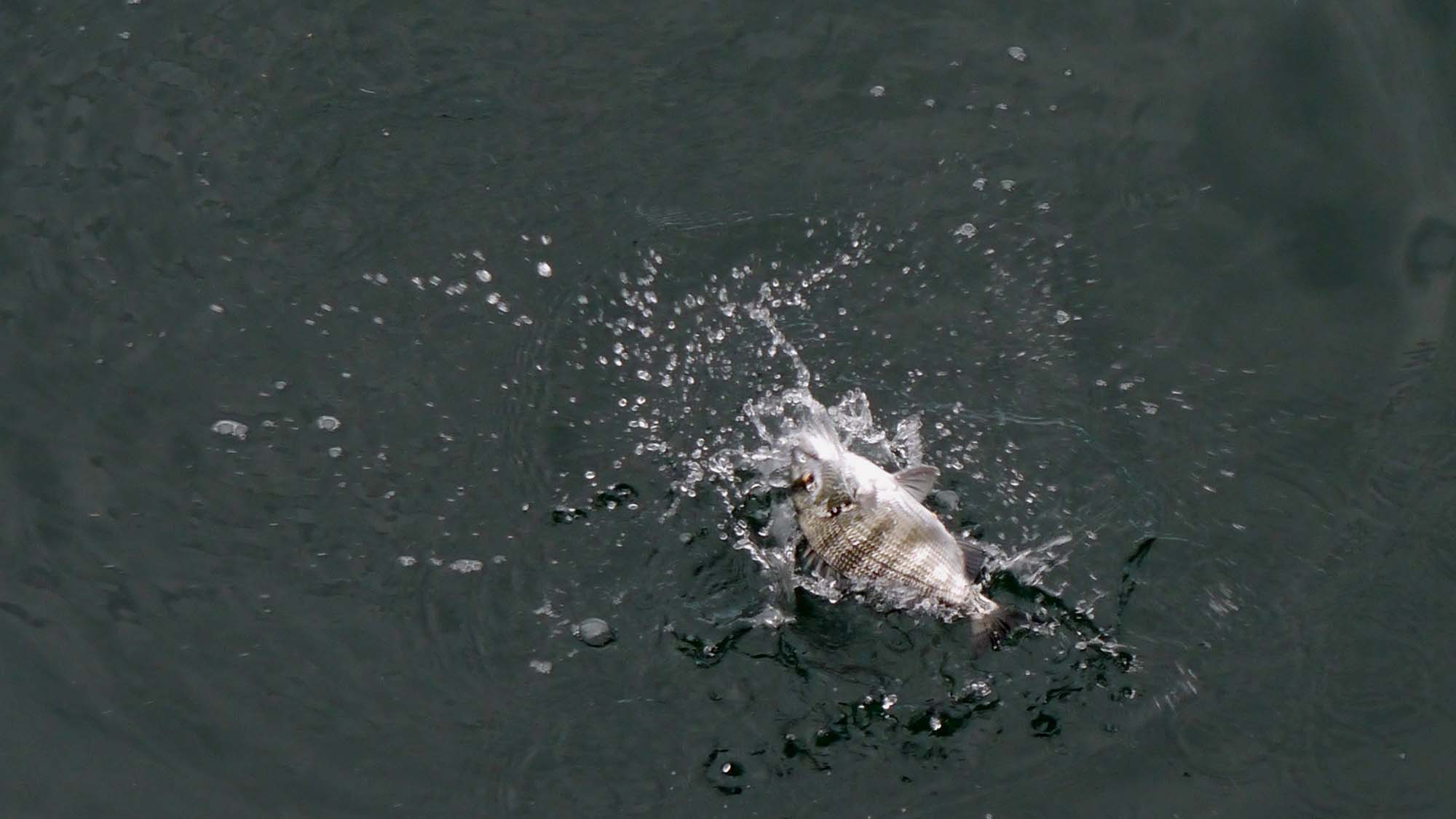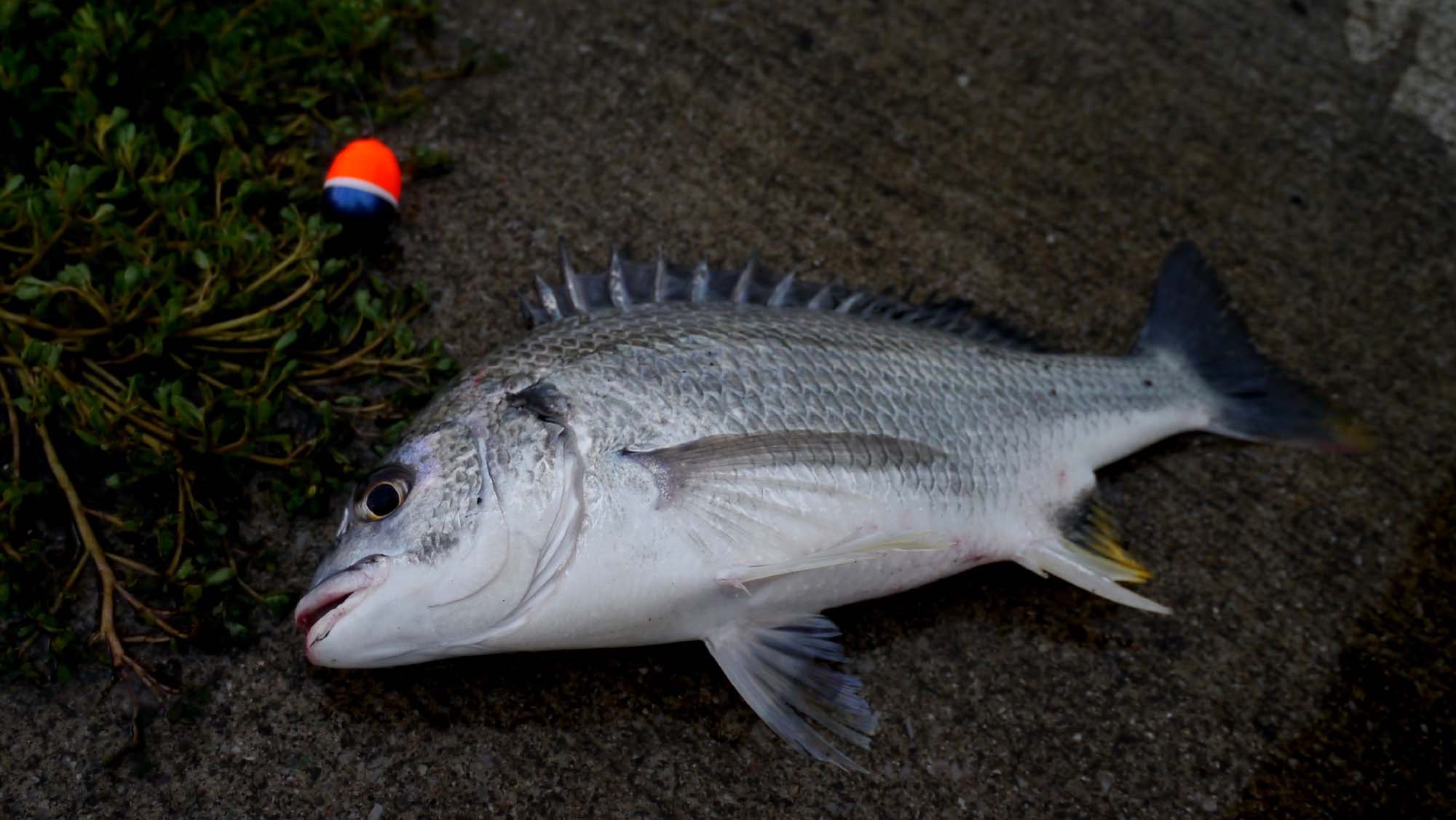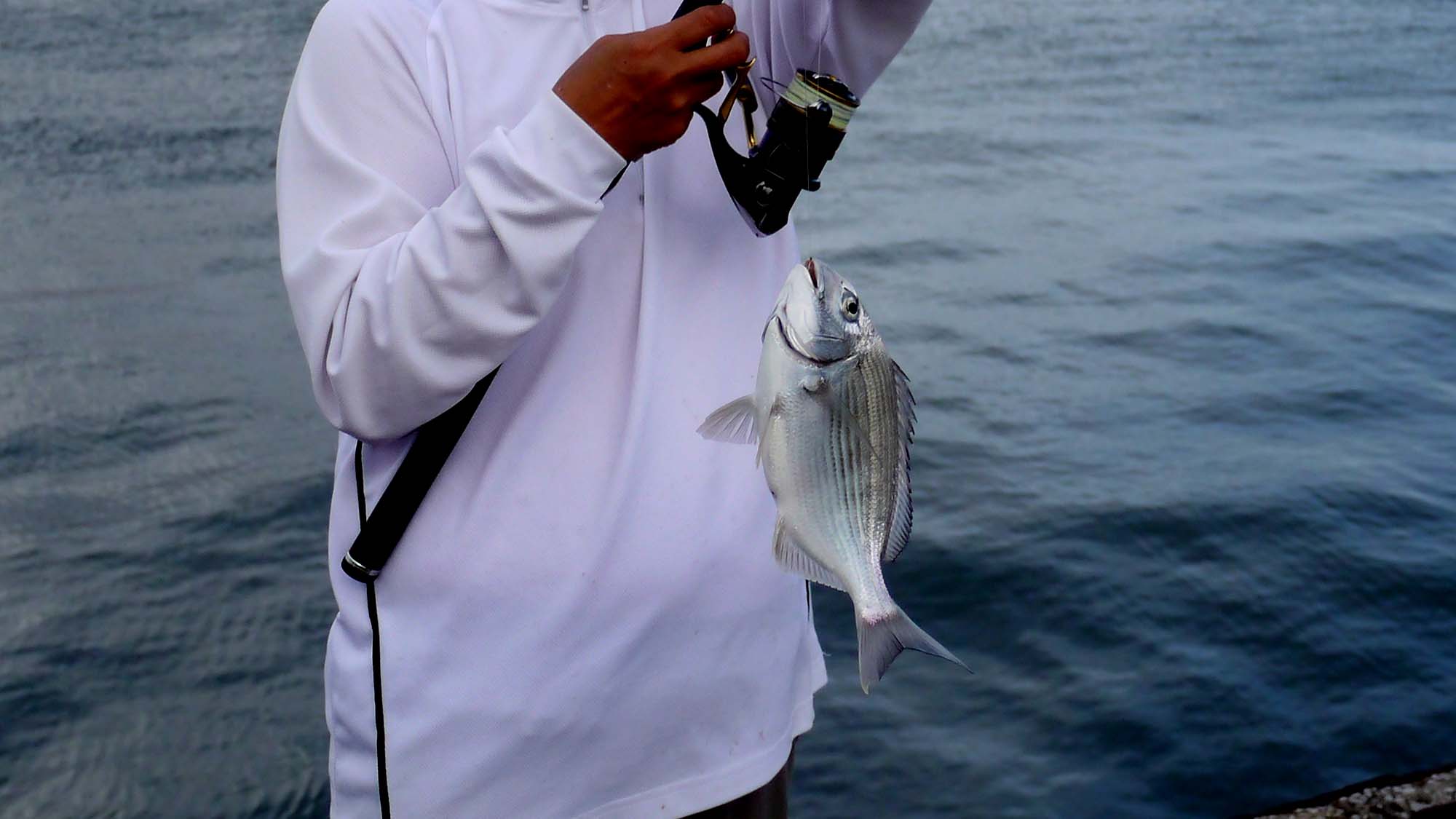 フカセ釣りを始めると、一投目から良型のアジ。4本ほど釣れたらアタリは遠のき、変わってメイタやマダイの仔が何度も竿を曲げてくれました。エサ取りのアジゴはほとんど釣れません。フグもほとんど居なくて、オキアミ生のサシエが20~40m沖の底まで届いてくれるのです。