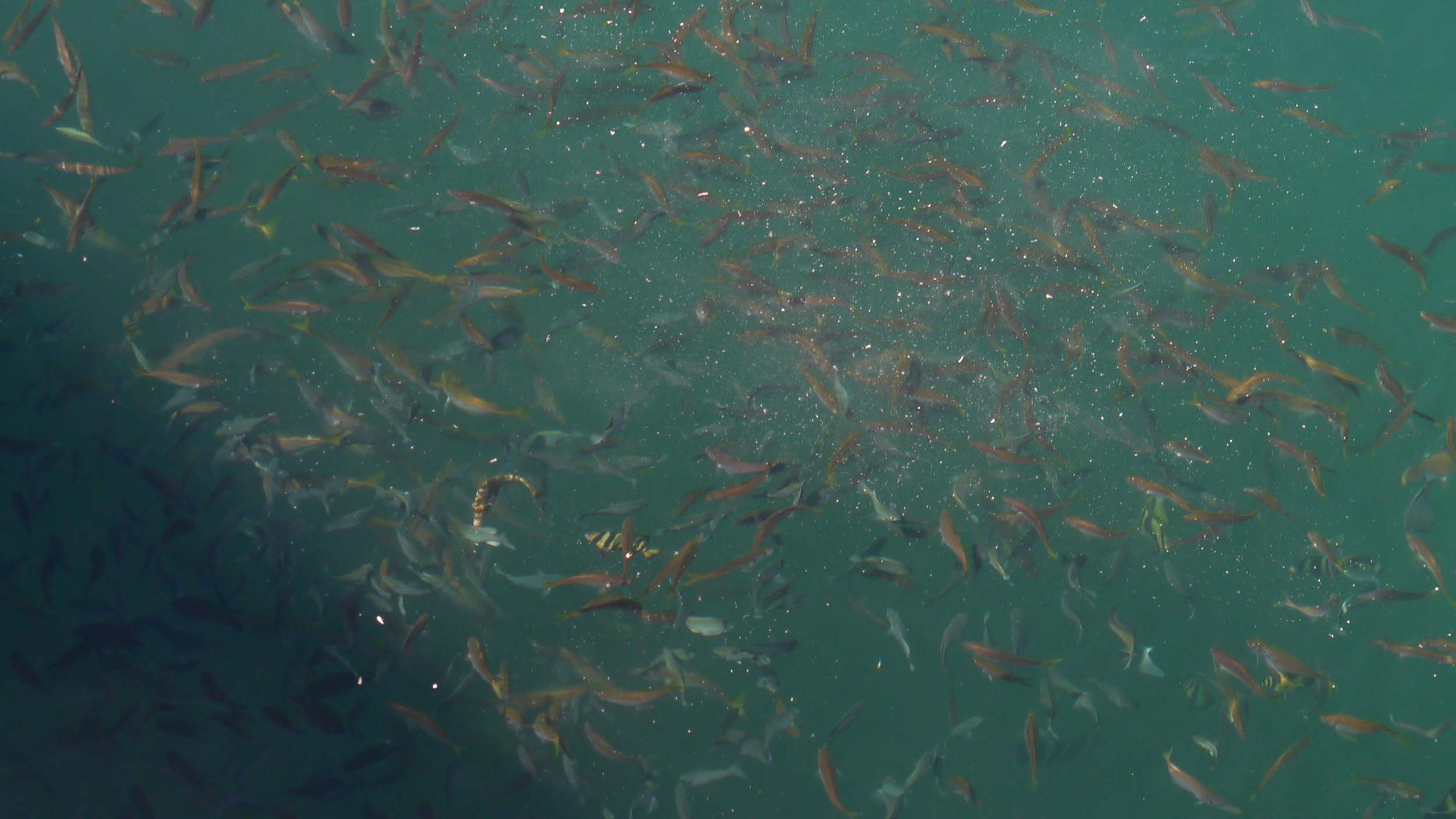 管理釣り場内の防波堤釣りでは、10㎝級のアジゴ・それ以上小さなコッパグレ・マダイの仔・カワハギの仔・イシダイの仔・スズメダイなどがワ~~~~~ッと集まる中、持参したオキアミやネリエはひとたまりもなく、下に見える20㎝級のアジには届きません。
