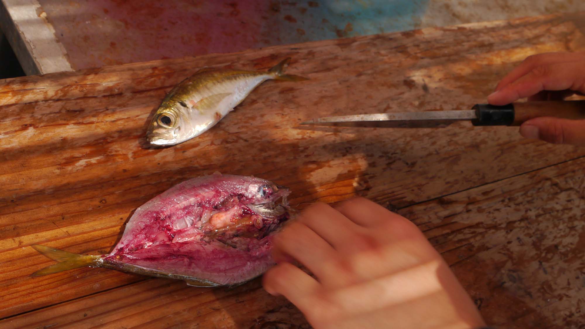 これは切り身でアジを狙うしか方法はありません。エサにすべく10㎝級のアジゴを狙うと、チャリコ(マダイやチダイの幼魚)に邪魔され、アジゴがなかなか釣れません。そんな中、2匹のアジゴをゲットして切り身のエサを作りました。