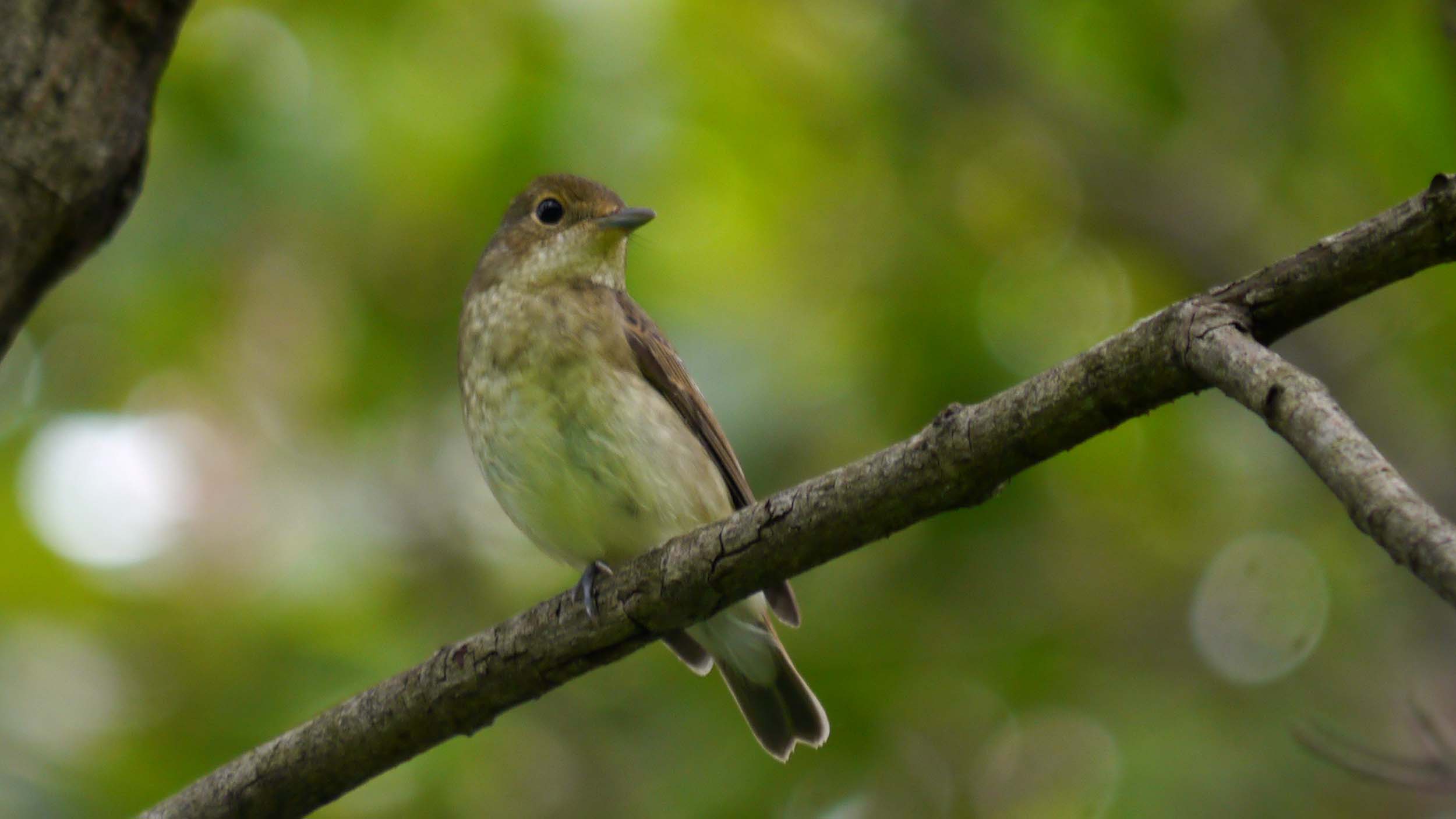 このキビタキのオス若は、翼などがまだらで黒色が混じり、黄色い羽毛はなんとか識別出来ます。でも黄色い眉斑は形すら見えません。前から見るとメスの成鳥と変わりない感じです。