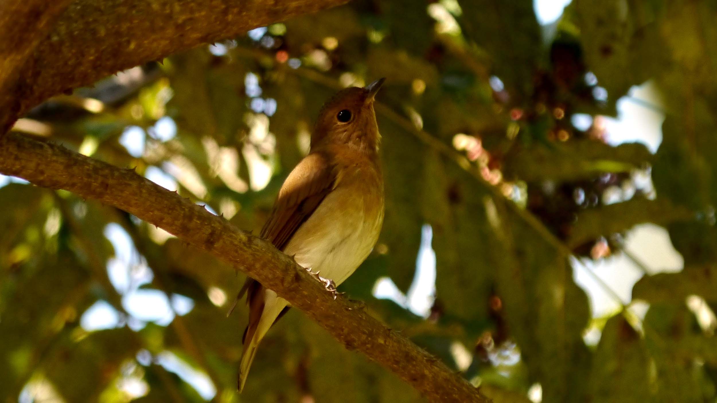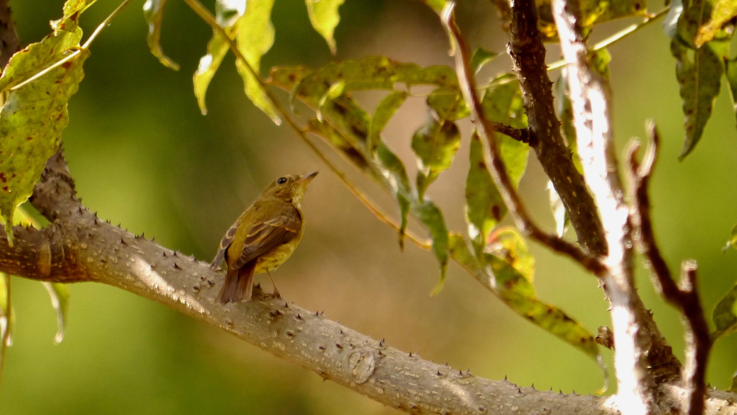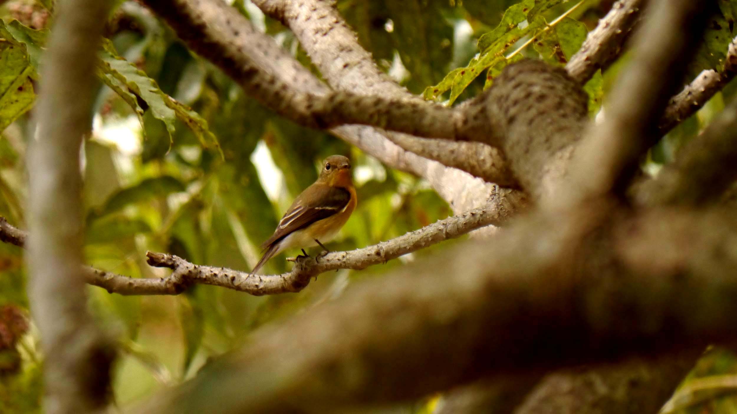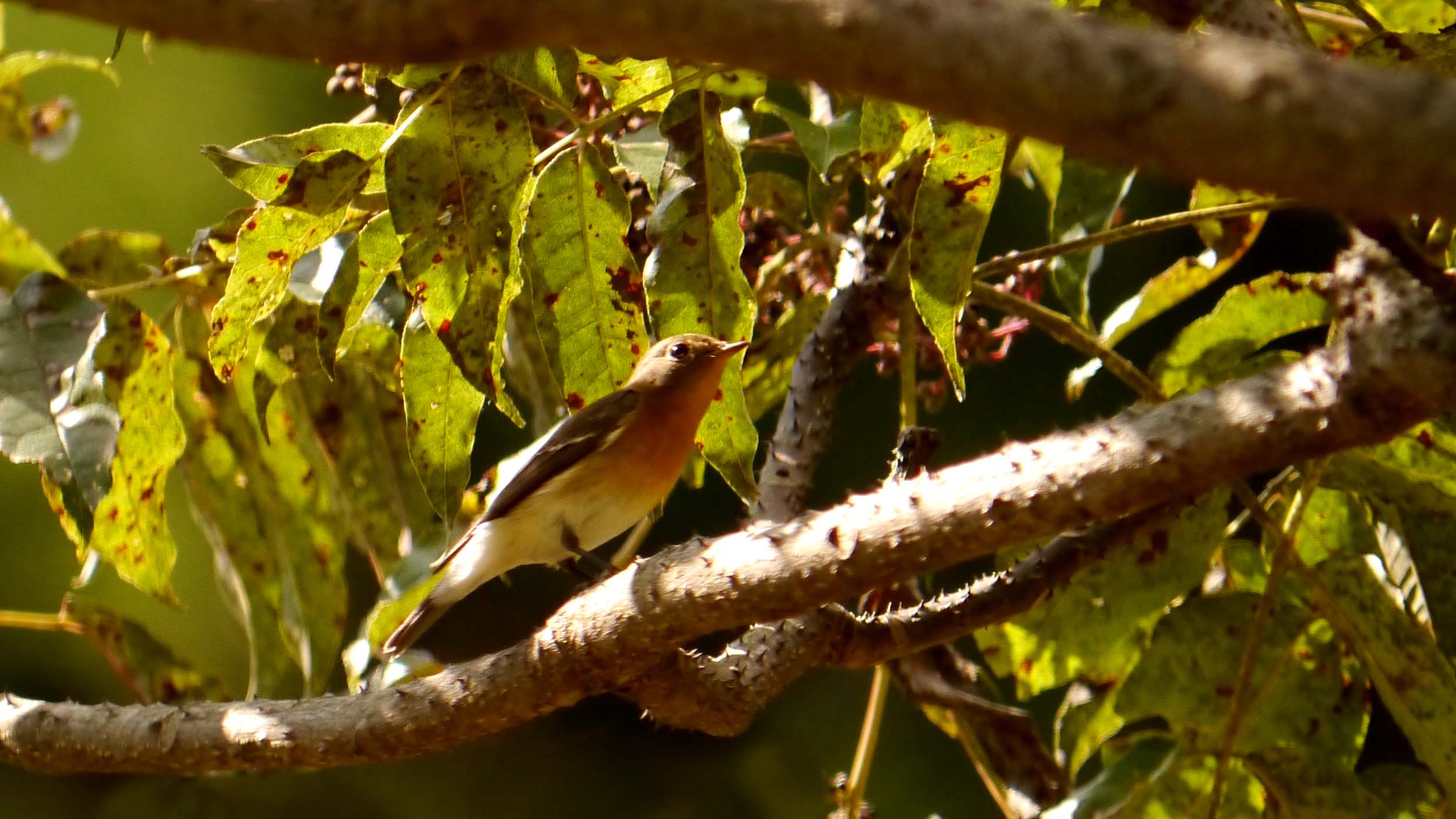 この頃になると、旅鳥のムギマキが通過する時期なので、一昨日からムギマキチェックを始めたばかり、10月18日に、キビタキのオスとメスを確認した、県民の森の奥にあるカラスザンショウで、早くもメスのムギマキを確認です。