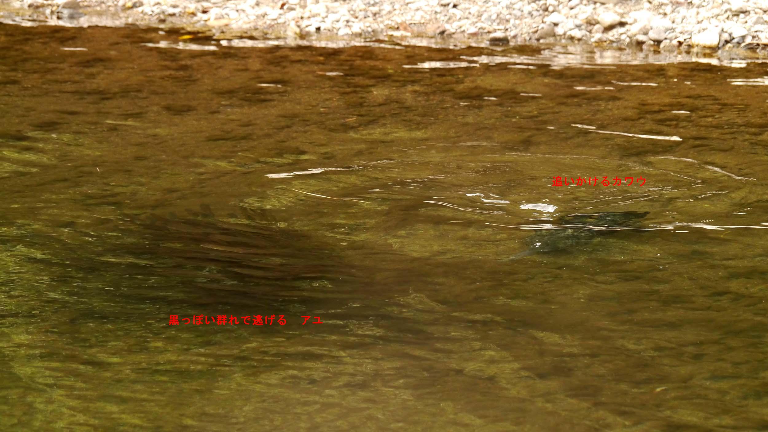 アユを狙う鳥は沢山居て、アオサギ・ヤマセミ・ミサゴなどが、この界隈で狩りを繰り返しています。今日は一羽のカワウが群れアユを追って潜っていましたが、アユたちは一羽のカワウを翻弄していました。