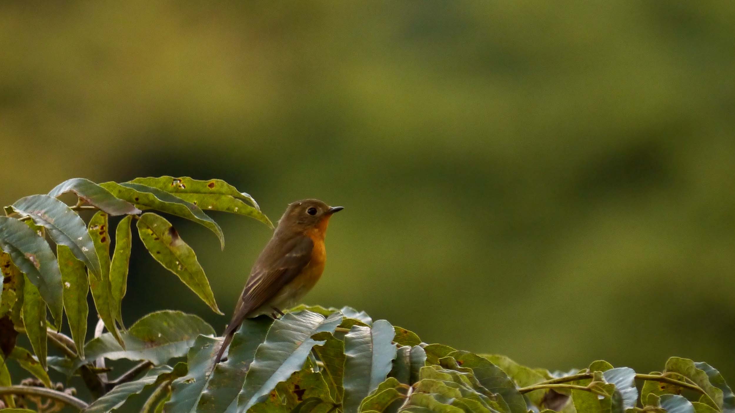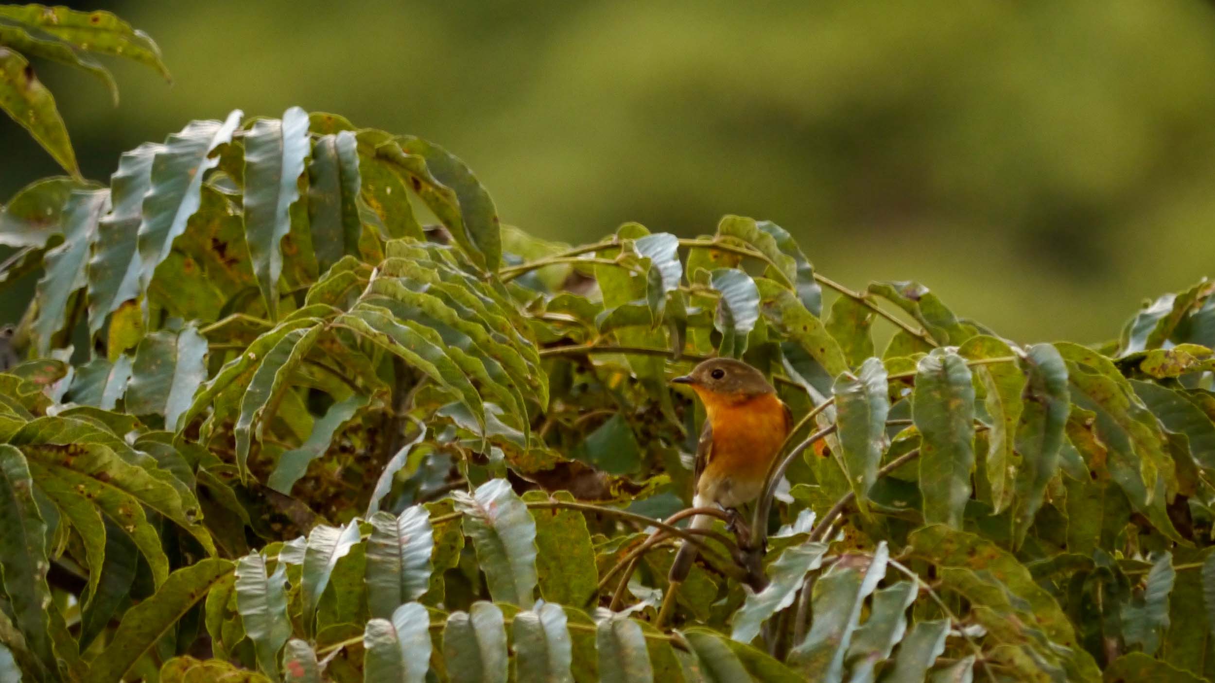 ここでキビタキのメスを見ていると、胸がオレンジの鳥を発見。何度か出てきてくれたので撮影にも成功です。胸のオレンジが濃いので、眉半が撮れるまで撮影を続けました。彼の眉半はとても薄いですが、オスの証を備えていました。