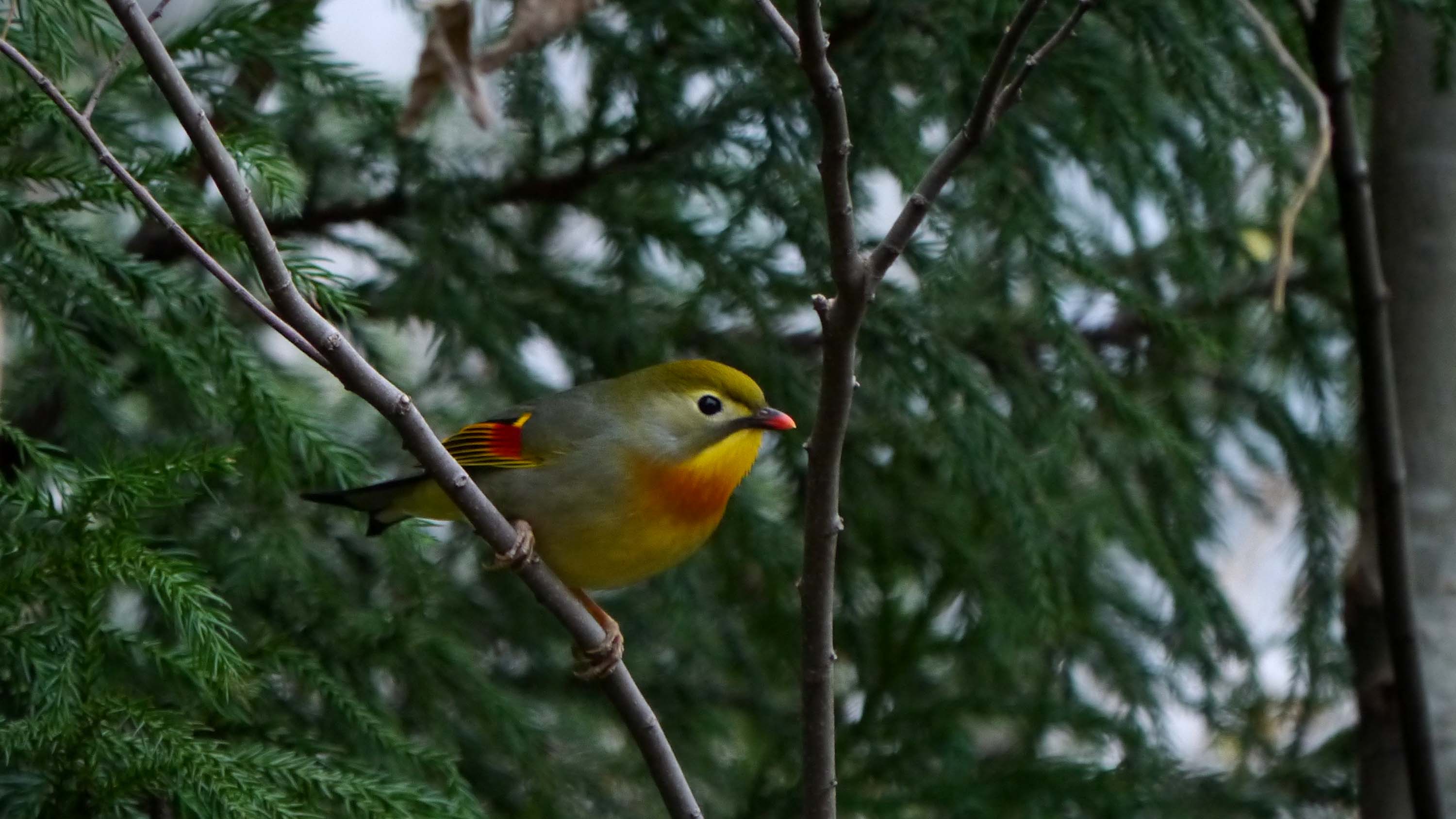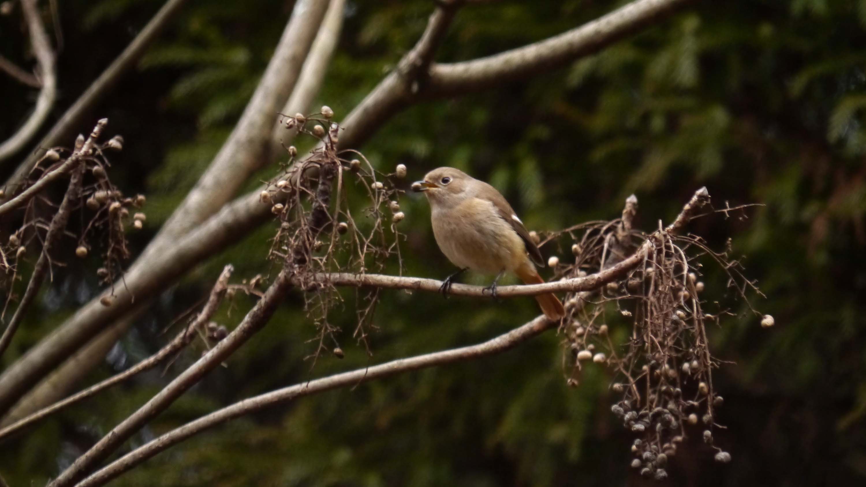 戻って、奥のカラスザンショウの手前にあるハゼの実は、少し残っていたのでチェックすると、ルリビタキのメスが3羽、オスは1羽、ジョウビタキ・ヤマガラ・コゲラ・シジュウカラ・メジロなど。その下の藪では2~3羽のウソも来てくれました。