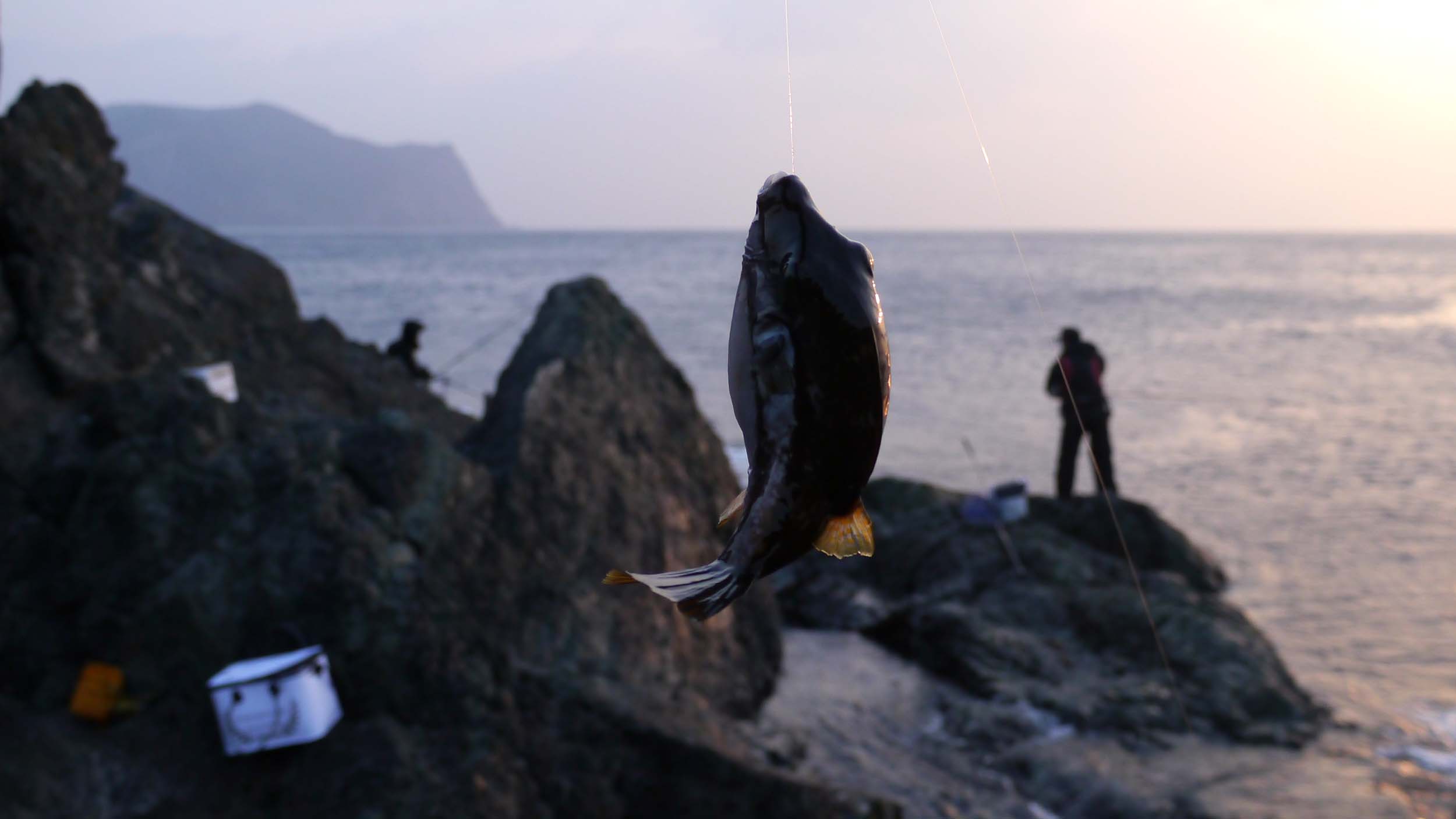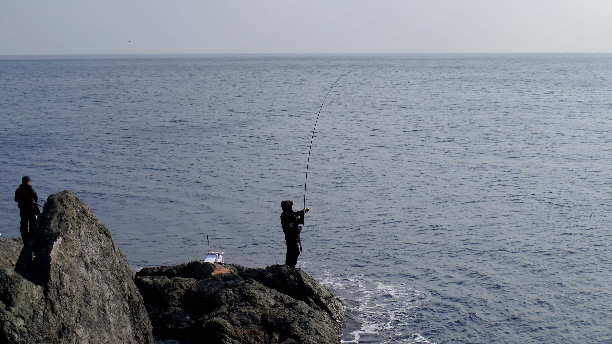 今回は本命ポイントで10分くらい竿を振りましたが、強風による寒さと、スズメダイ・キタマクラ・トウゴロウイワシなど3種類のエサ取りに、マキエがもたないと判断し断念しました。